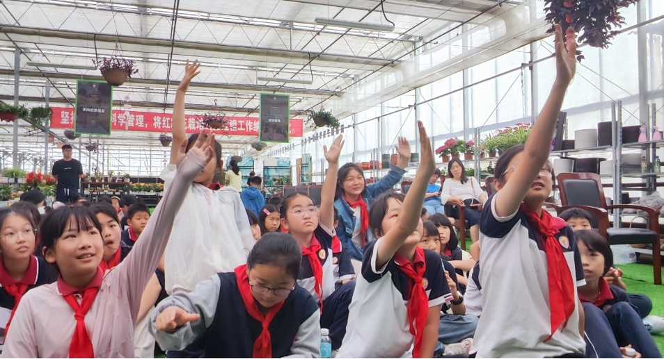 随后,工作人员引导学生来到花仙子研学基地,由合作社的技术员为小朋友们开了一场植物科普讲座。为调动他们的积极性,技术员采用提问的方式,回答正确一个问题可以奖励一盆花,小朋友们争先恐后地举手回答。在这种愉快的氛围中,孩子们了解了花卉的分类方式、生长环境要求、在历史文化中的地位等知识,工作人员还以图片结合解说的方式,带着小朋友们认识了各种各样的花卉。