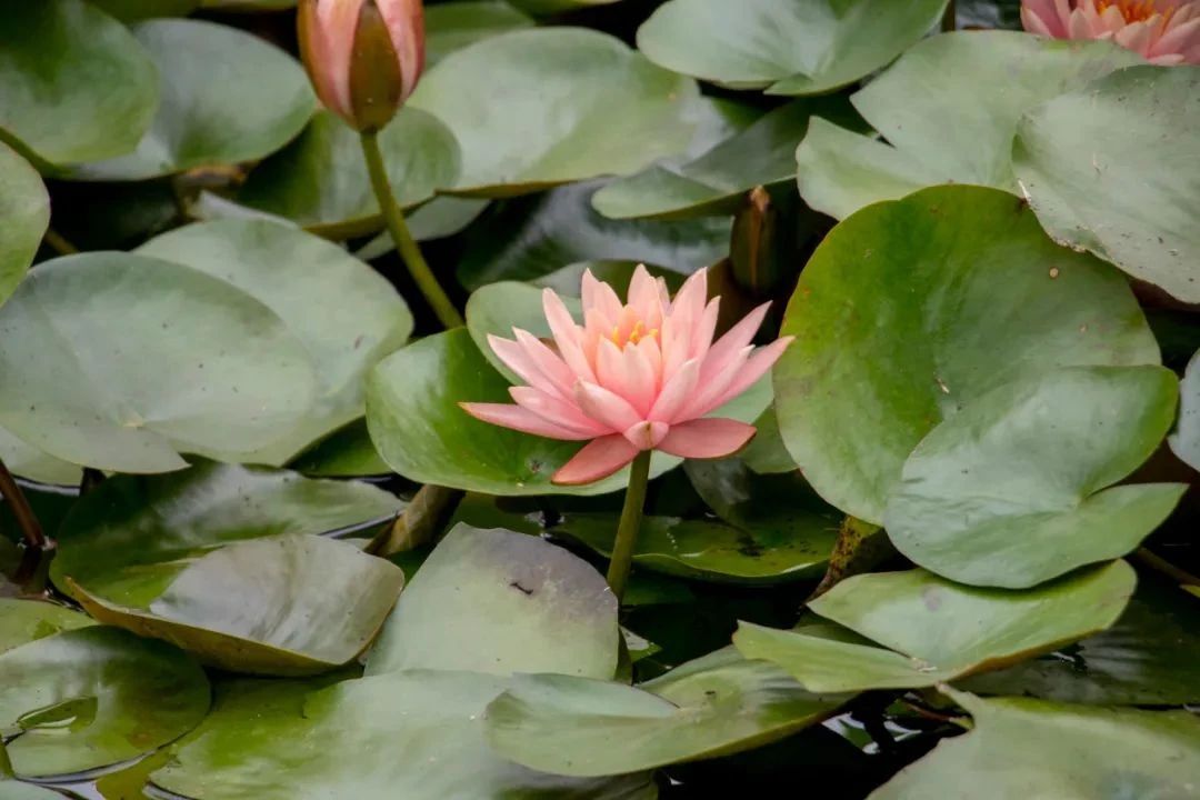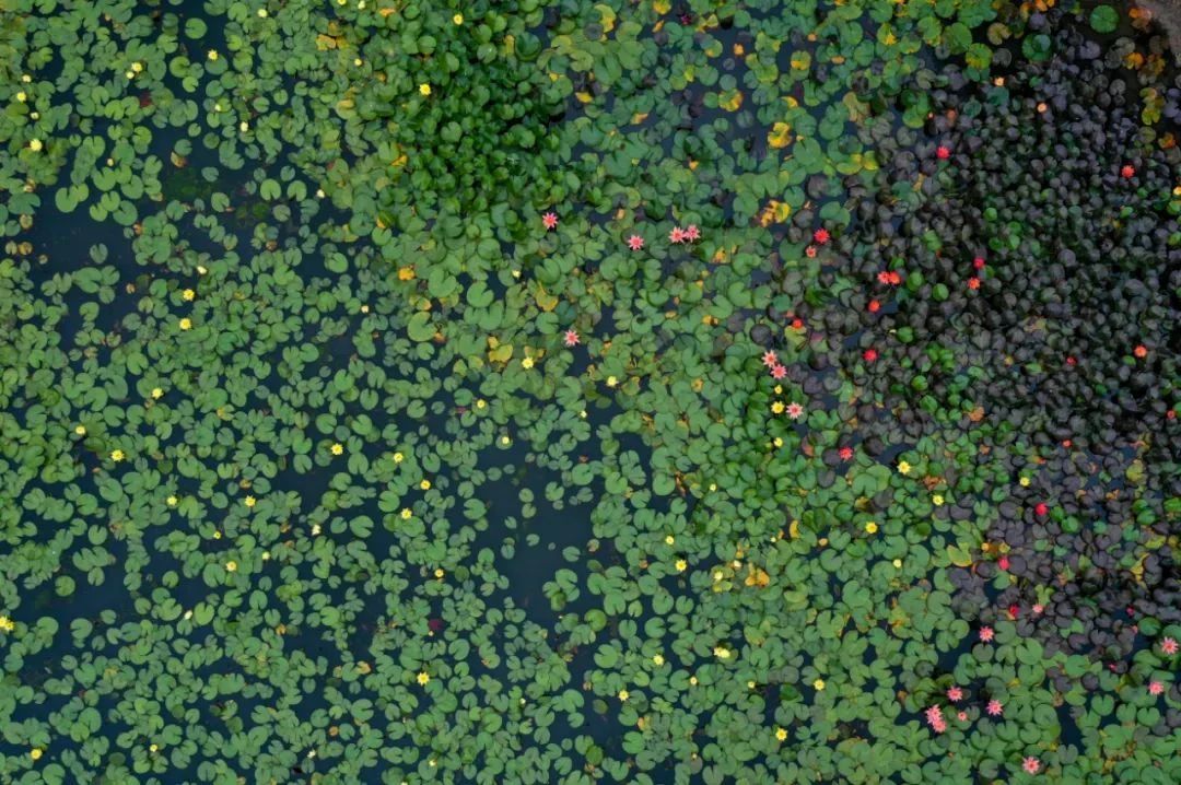 俯瞰满池荷叶中的粉嫩清新。