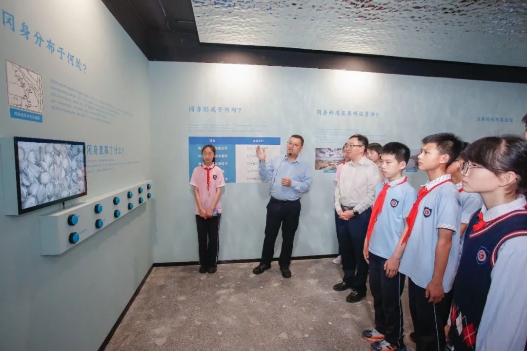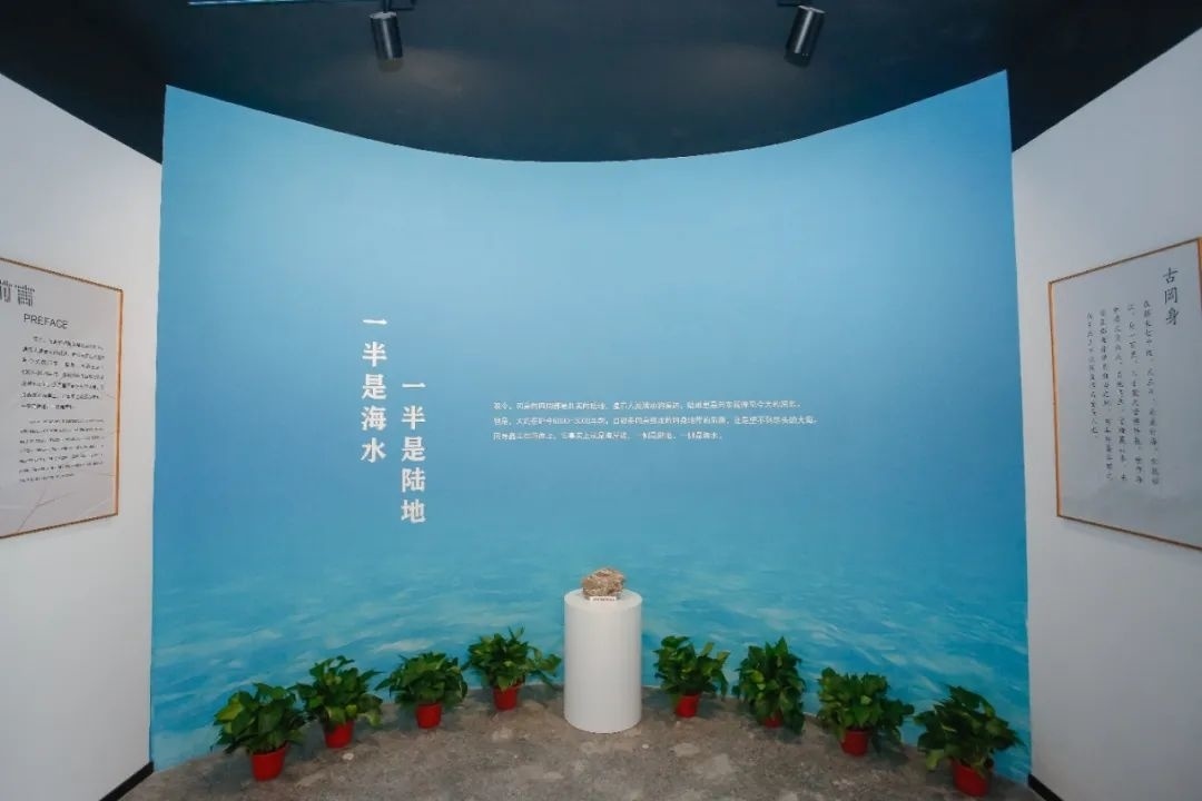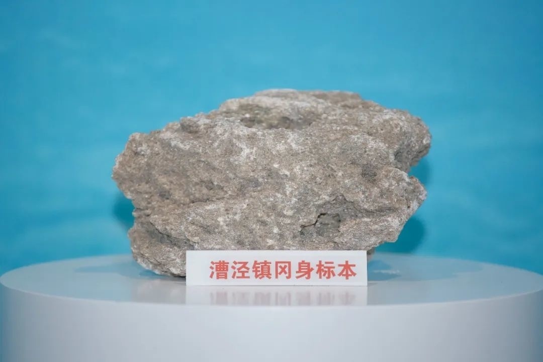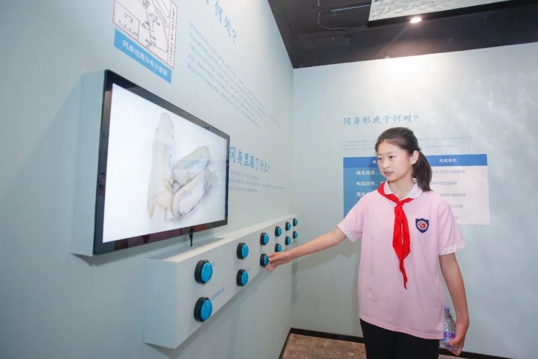 走进金山区冈身遗址展示馆,映入眼帘的是一块漕泾镇冈身标本,仔细看能在标本上找到远古贝类生物的壳体。展示馆共分为“海洋”和“陆地”两个主题,并设有触摸互动区,游览者可以详细了解冈身的分布、形成及其历史意义等。
