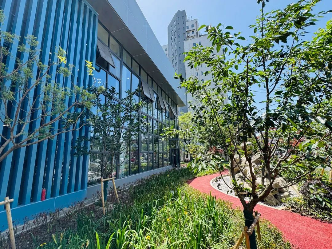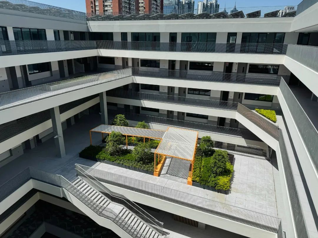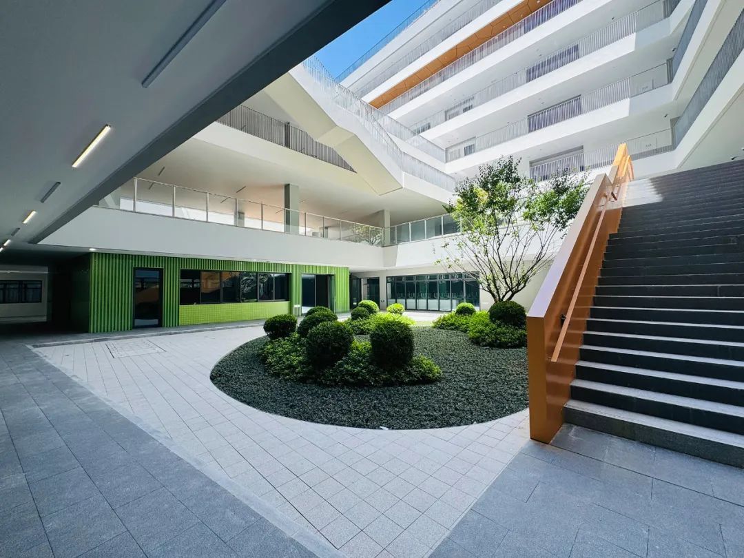 同样在5月中旬交付的还有长寿地块小学,现正式更名为上海市江宁学校(梓棉校区)。建筑物主体采用砖红色、白色、绿色及黄色。校内室内中庭、室外连廊、屋顶花园、各种形式的庭院和广场营造出立体多样化的校园公共空间,为积极交流创造硬件条件。同时设置更多功能教室提供更多的选修课程或自组团队研究空间;公共空间多功能使用,研讨、阅览、餐饮、休憩、活动、展示,激发学生主动创新动力。