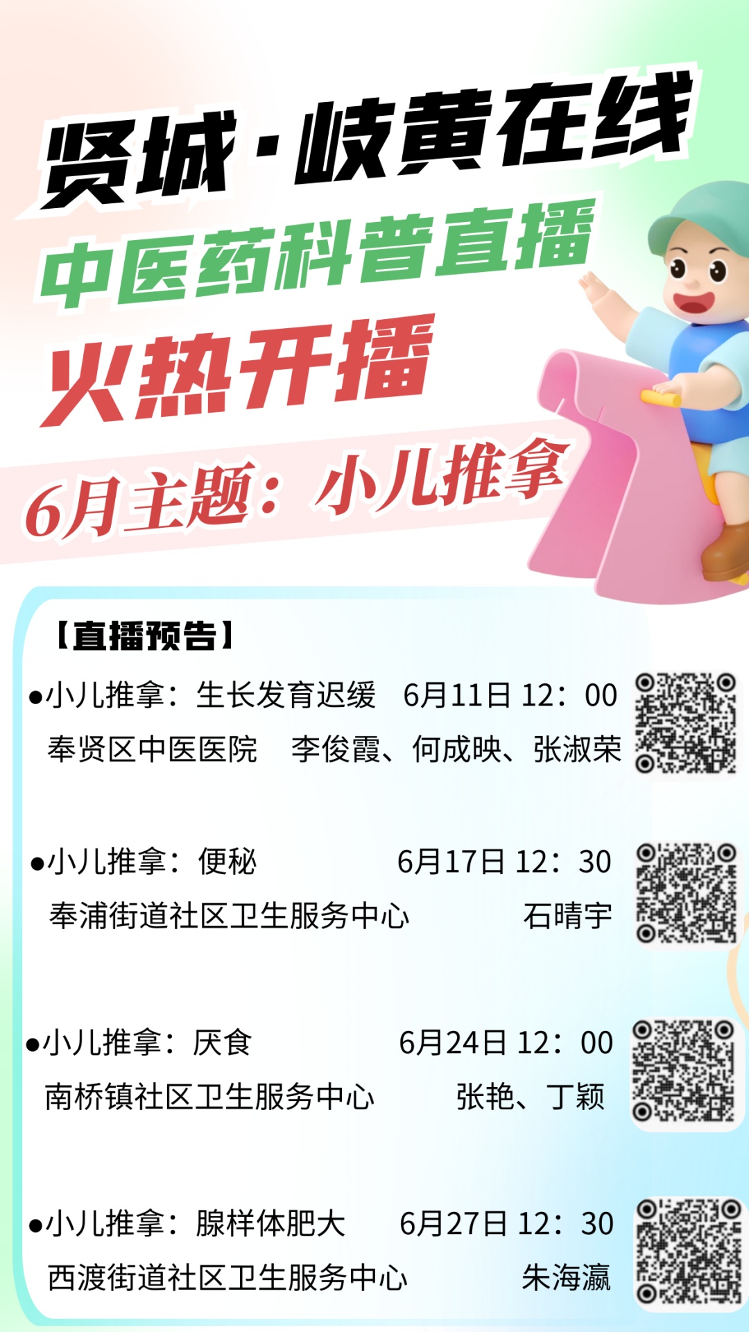 奉贤区卫健委诚挚邀请您预约并参与“贤城·岐黄在线”中医药科普直播。在这里,您将有机会与专家面对面交流,深入了解小儿推拿的神奇魅力。我们相信,通过您的参与和支持,我们将共同为孩子的健康成长贡献一份力量。