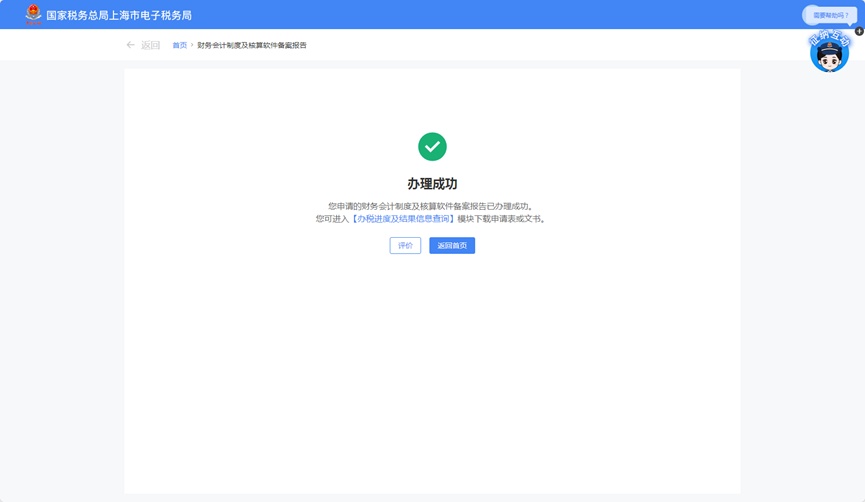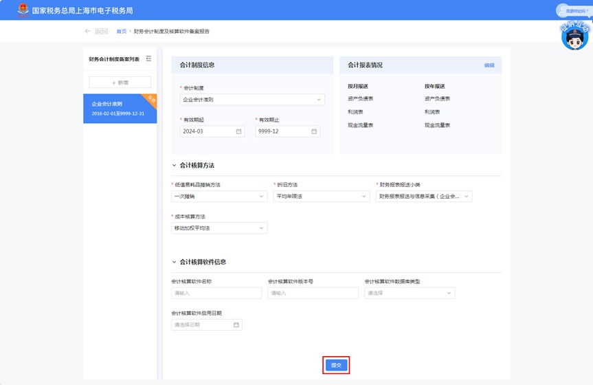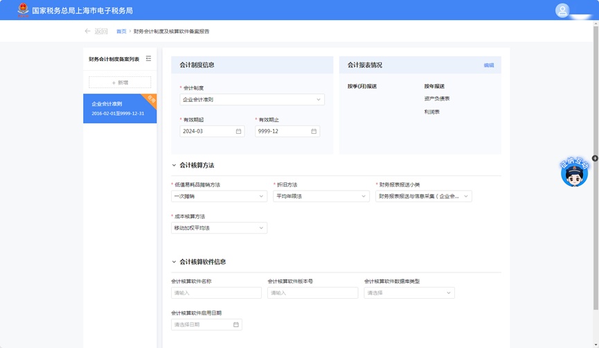 点击进入“财务会计制度及核算软件备案报告”模块后,系统将自动带出您当前正在使用的备案信息。