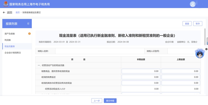 完成备案信息修改后,依次点击【我要办税】-【税费申报及缴纳】-【财务报表报送】-【财务报表报送及更正】进入,系统将自动带出现金流量表,就可以开始填报啦!