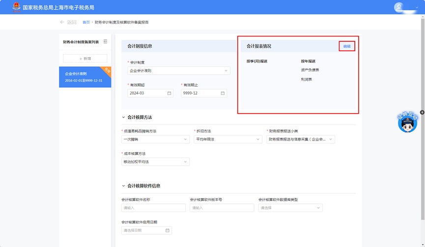 1.点击“会计报表情况”卡片右上角的【编辑】,对会计报表报送情况进行修改。