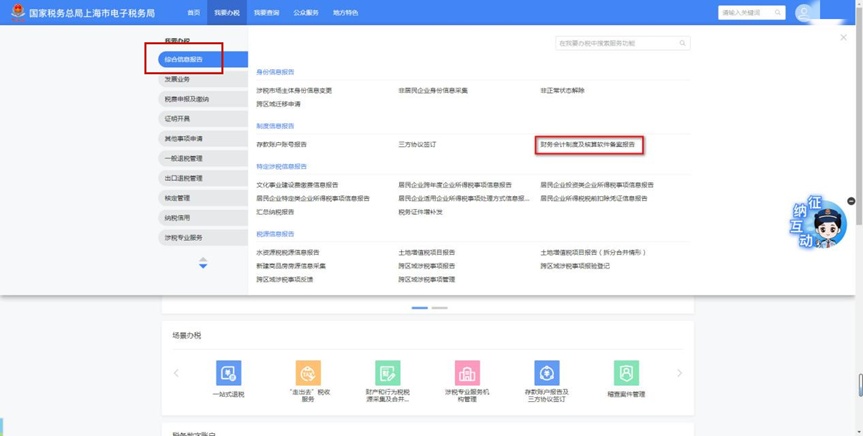 登录新电子税局后,依次点击【我要办税】-【综合信息报告】-【制度信息报告】-【财务会计制度及核算软件备案报告】进入。