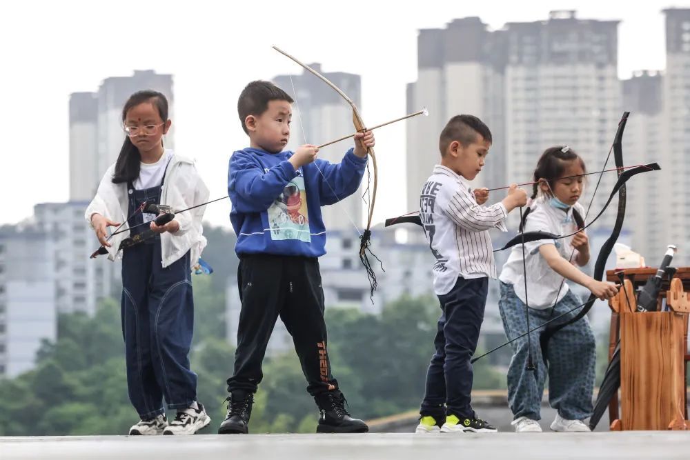 2022年6月3日,在贵州省贵阳孔学堂举行的端午活动上,几名小朋友在体验“射五毒”。新华社记者 欧东衢 摄