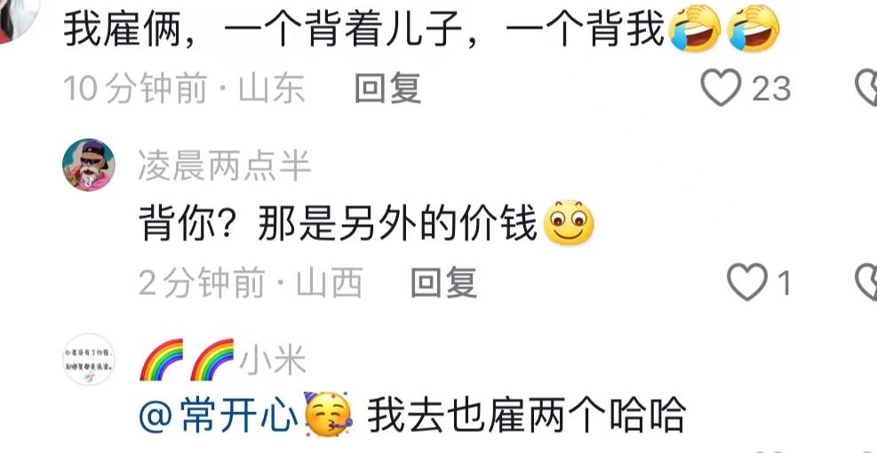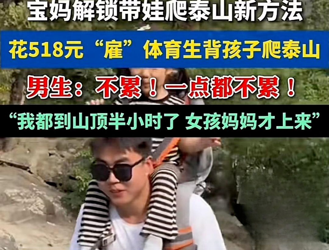 登顶三山五岳已经成了网红打卡必备项目。近日,一位宝妈直接解锁了爬泰山的新方法,再一次感受到了钞能力。她花了518元雇了当地大学的一个体育生,背着自己的娃娃登上了泰山。男生表示自己背着娃娃都到山顶半个小时了,宝妈才气喘吁吁跟上来。