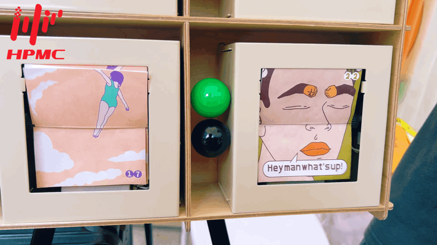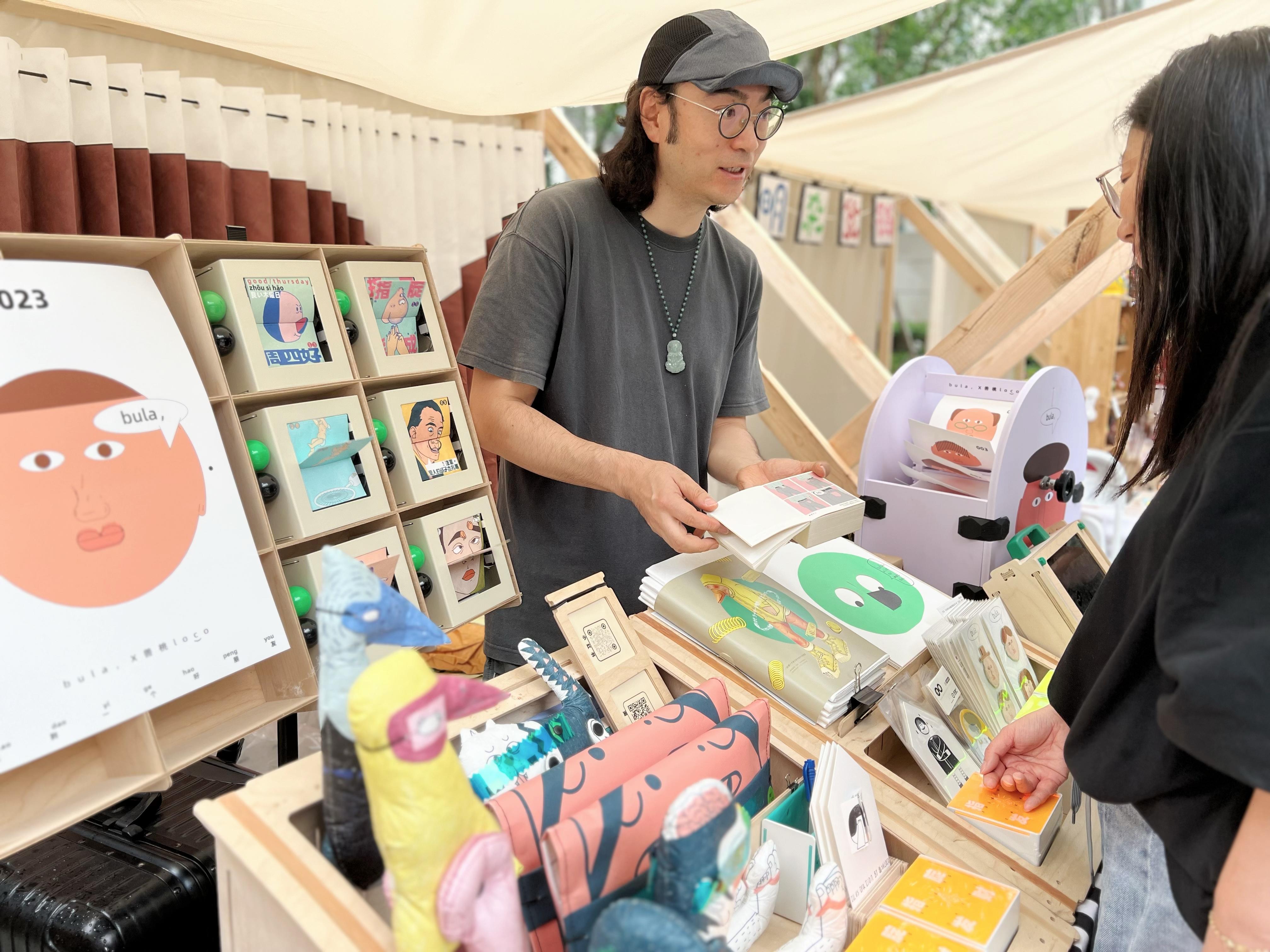 如果说“日常建筑学”呈现的是静态艺术,那“不啦,x 兽桃”展位则用动态创意装置夺人眼球。由主理人、插画师兽桃设计的翻页动画盒子,只需安装2节电池,便可持续翻页100小时的动画,“我用pad自学了动画软件后,想着是不是能设计一款带有翻页功能的小装置,于是找来了徐州产的铁壳,深圳产的电机和电池,再把自己设计的动画图案融入进去,便有了这款装置。”兽桃告诉记者。
