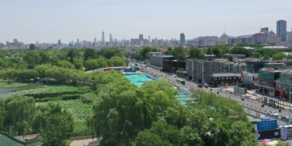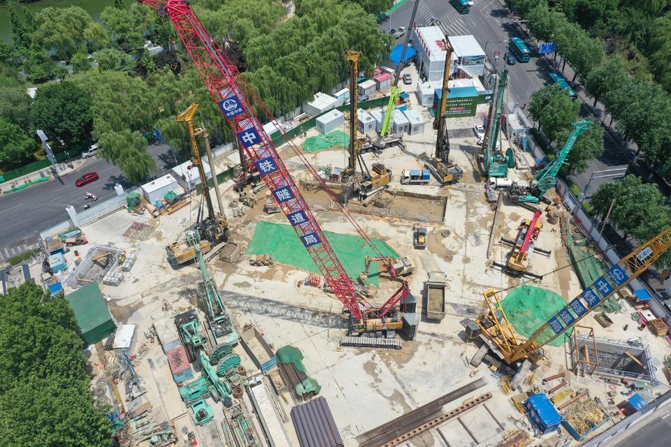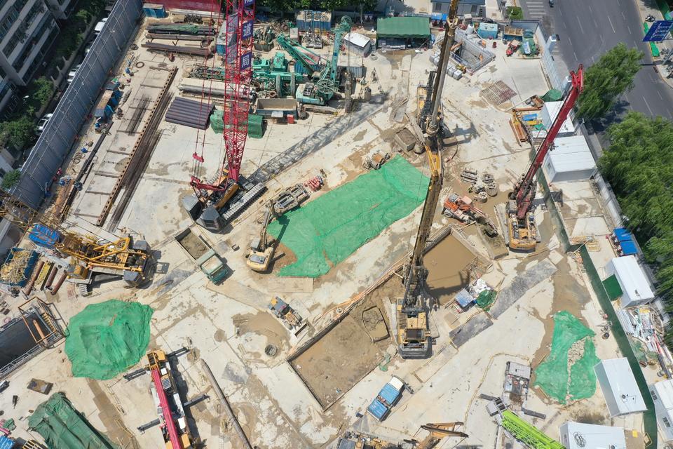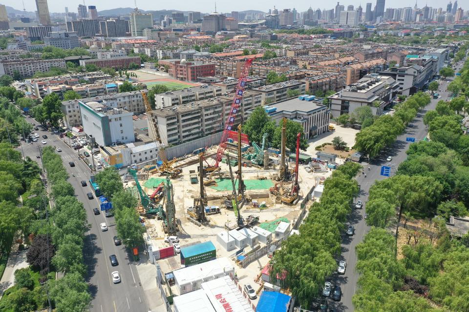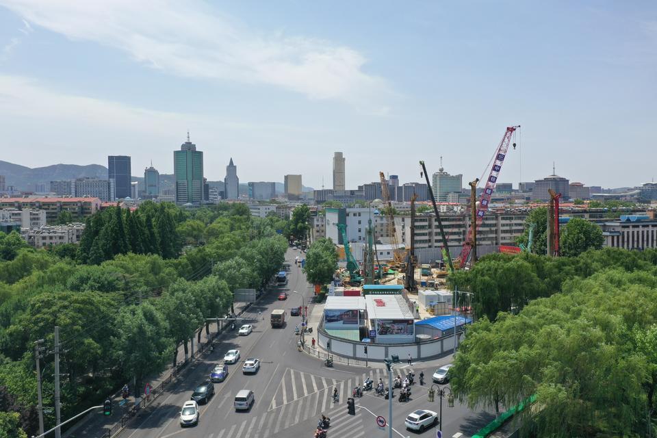 端午假日,航拍济南大明湖东南角的济南地铁6号线大明湖东站工地。 十几台大型机械正在施工,半年前还很安静的东湖大厦旧址一片繁忙。