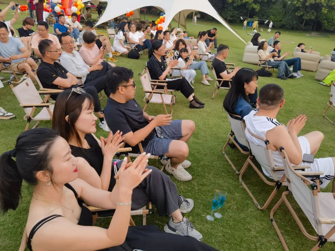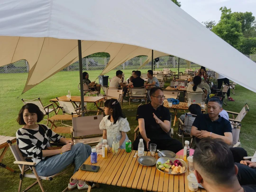 傍晚时分,碧绿的草坪上小狗撒欢,孩童嬉戏,一旁的长桌上摆着各种水果和点心,人们三三两两坐在天幕帐篷下喝着饮品聊着天,一派自在惬意的景象。