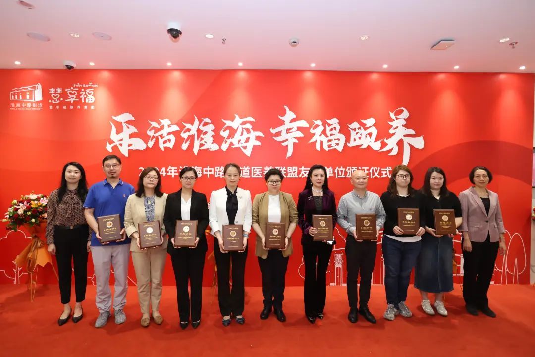 区民政局、区卫生健康委员会为上海交通大学医学院附属瑞金医院卢湾分院、香山中医医院、中国初级卫生保健基金会等9家“淮海中路街道医养联盟”友好单位颁发证书。