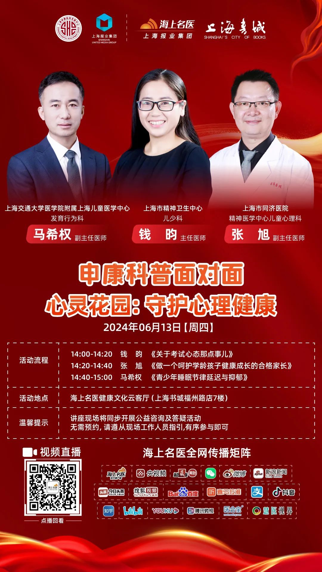 本期活动邀请了三位分别来自同济大学附属同济医院、上海市精神卫生中心和上海交通大学医学院附属上海儿童医学中心的权威专家,围绕考试心态、睡眠健康以及家长心理调适等相关问题,开展健康科普专题讲座,并为广大市民提供公益健康咨询。详情如下: