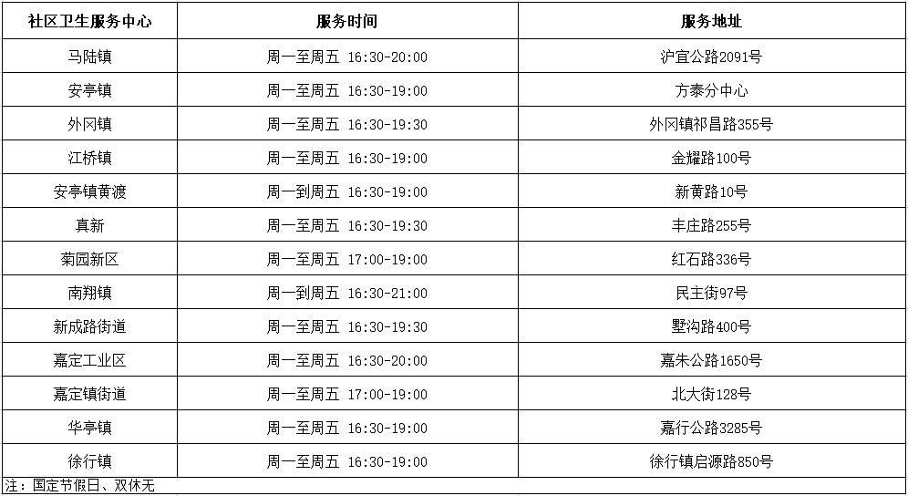 此外,嘉定部分社区卫生服务中心也推出了夜门诊服务,主要以全科为主。