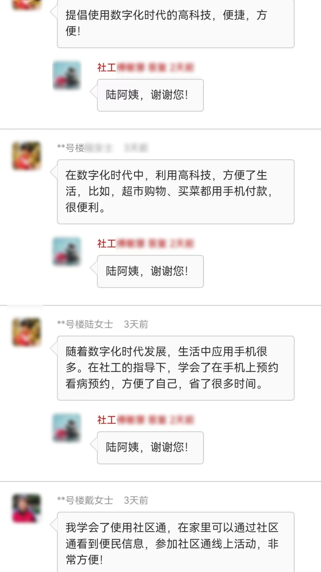 各居民区以线上“社区通”平台、线下座谈会等形式,重点针对老年人群体,了解居民对数字化时代各项新技术的了解情况,以及对手机、电脑等相关操作的掌握情况。通过互动交流,提升他们融入数字生活的积极性。