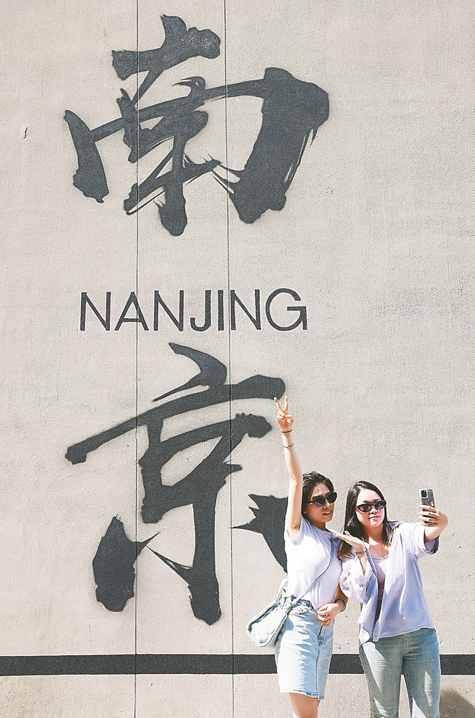 游客在悦动·新门西“南京”墙前打卡拍照。 记者 赵亚玲 摄