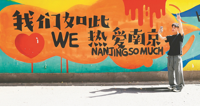 在南京市鼓楼区云南路、上海路交界处,穿过一座由“JINYIN STREET”字母雕塑堆垒而成的景观,几面色彩浓烈、画风活泼的墙绘,十分夺人眼球。“我们如此热爱南京!”“没错!我们都热爱鼓楼!”墙面上,各种肤色的青年角色拿着喇叭,欢乐地奔跑呼喊。节假日时,在墙绘前等待合照的年轻人经常排起长队。