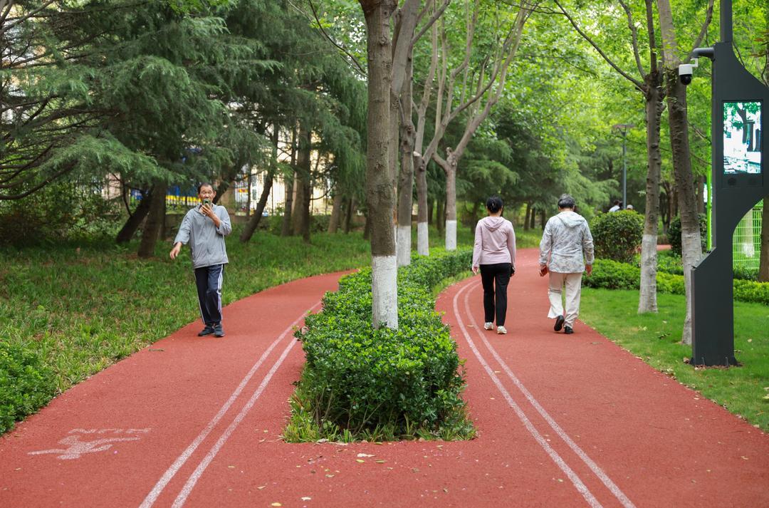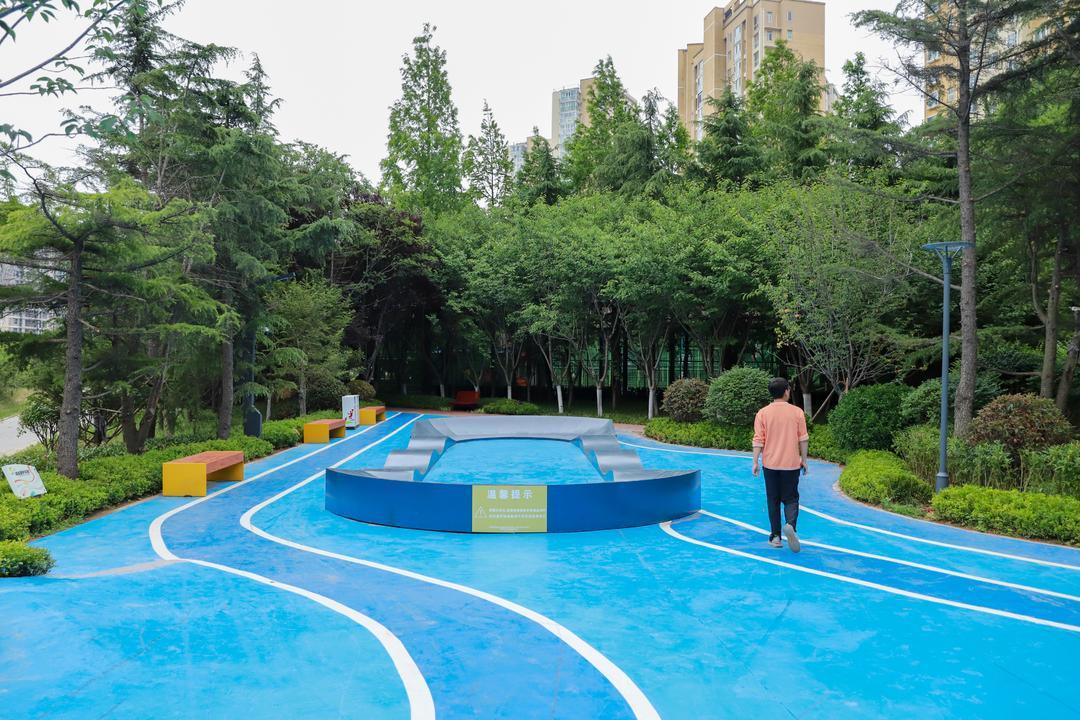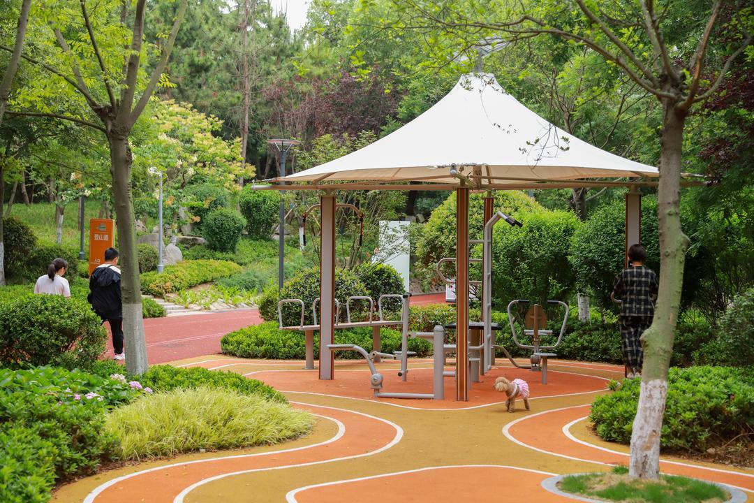 深圳路体育公园以绿化为基调、运动为特色,将健身器材和儿童游乐、适老化等设施有机嵌入公园,与自然生态融为一体。