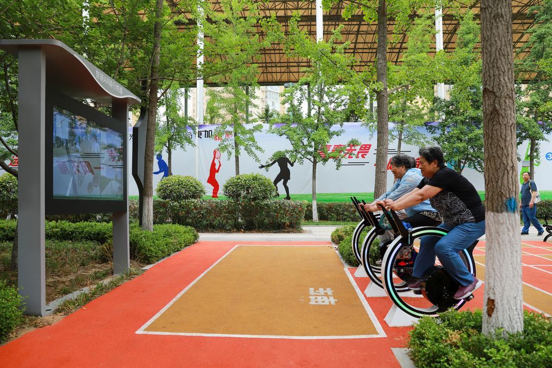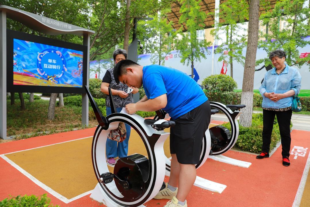 6月14日上午,青岛市崂山区深圳路体育公园内,附近居民使用“智能AR骑行终端”健身。