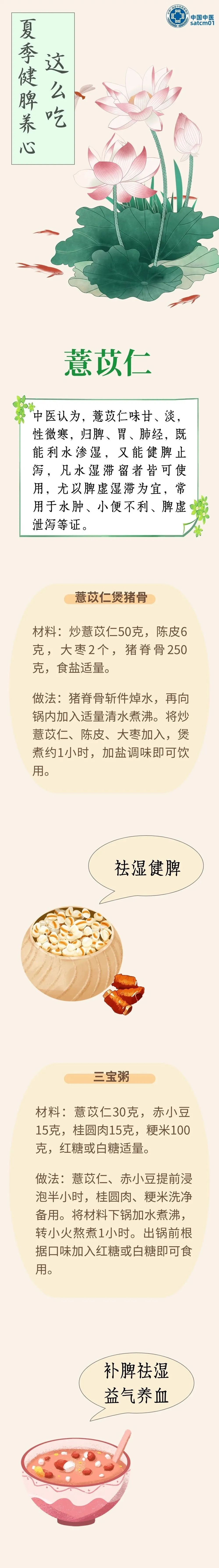 夏季温度逐渐升高,阳气渐旺,雨水也有所增多,湿热开始向人们袭来。此时养生要注意健脾祛湿、养心护心。饮食应清淡,以易消化、富含维生素的食物为主。下面介绍几款健脾利湿、养心安神的食材和相应食谱,以供选用。