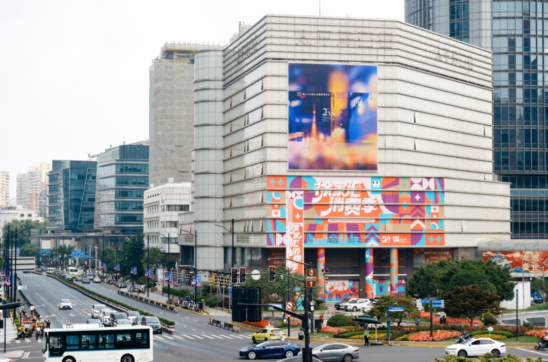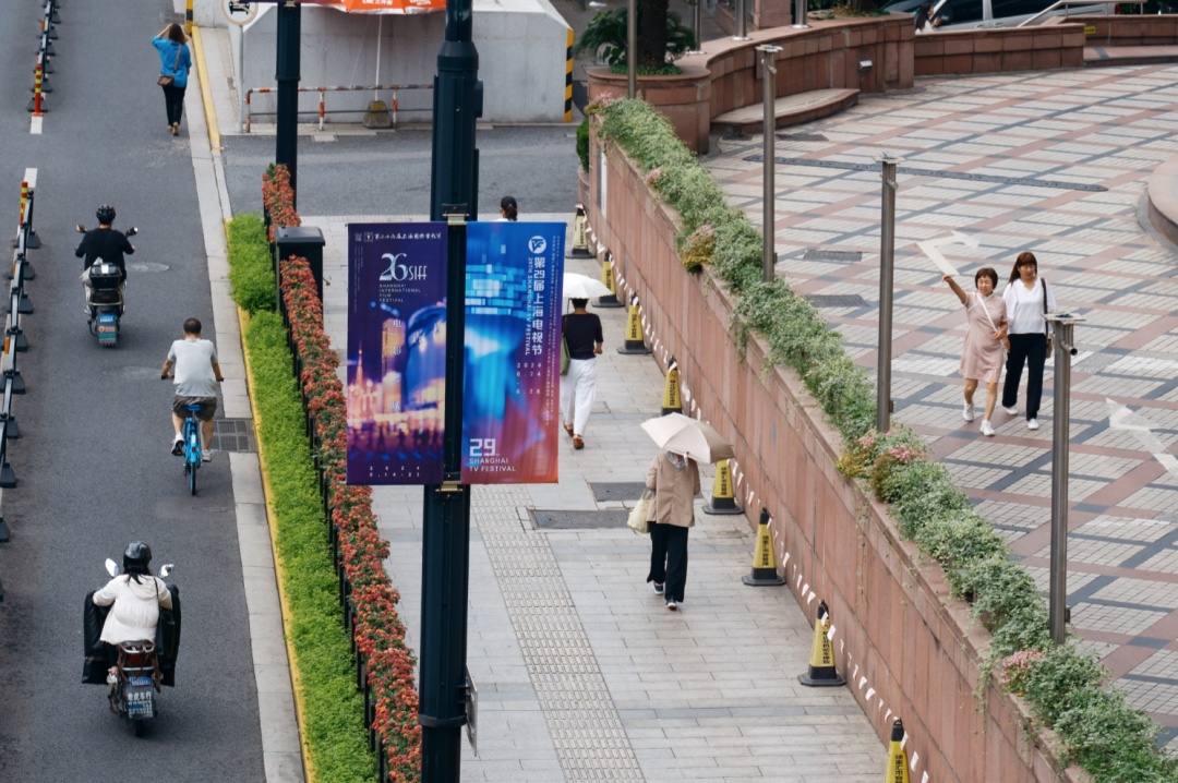 在徐汇多个主干道,以橙蓝为主色调的“双节”海报道旗和葱葱郁郁的绿化树、绿化带相映成趣,让市民游客在行走间就能感受到扑面而来的“光影”韵味;在重要商圈,户外的巨幕投屏上,即将上映的影片预告及历届电影节、电视节的精彩回顾循环播放,引人憧憬的同时,也讲述了这座城市与影视的深厚渊源。