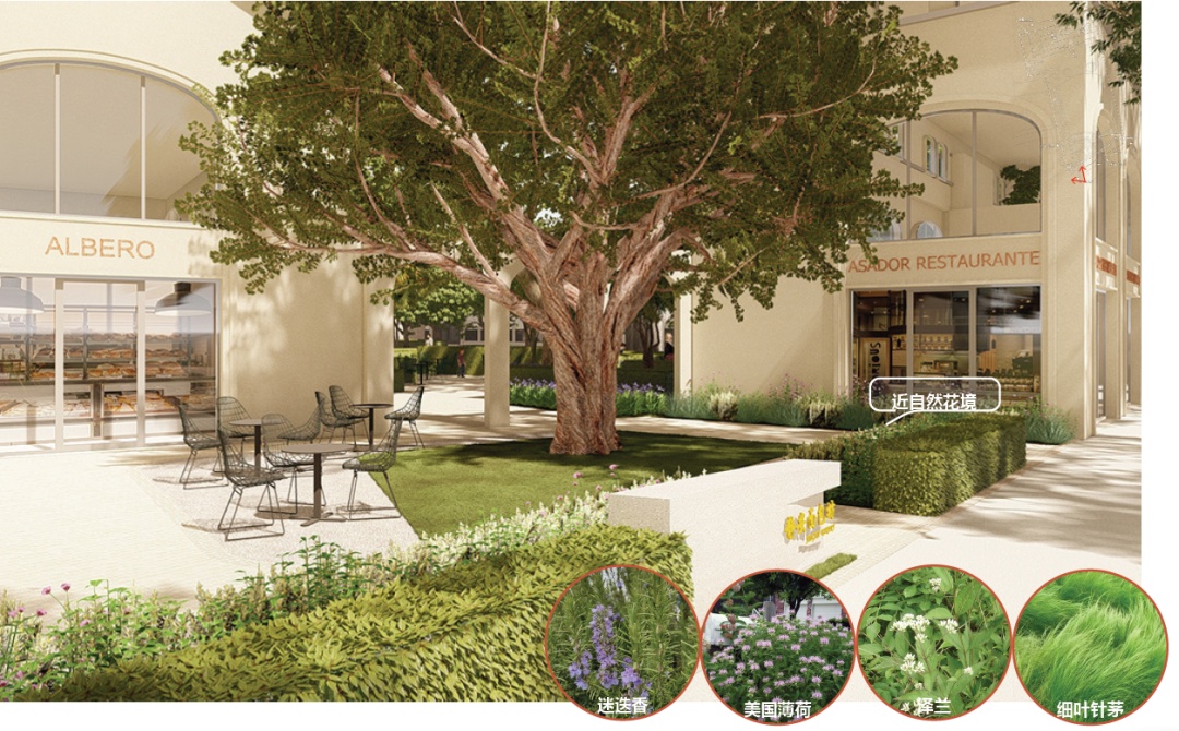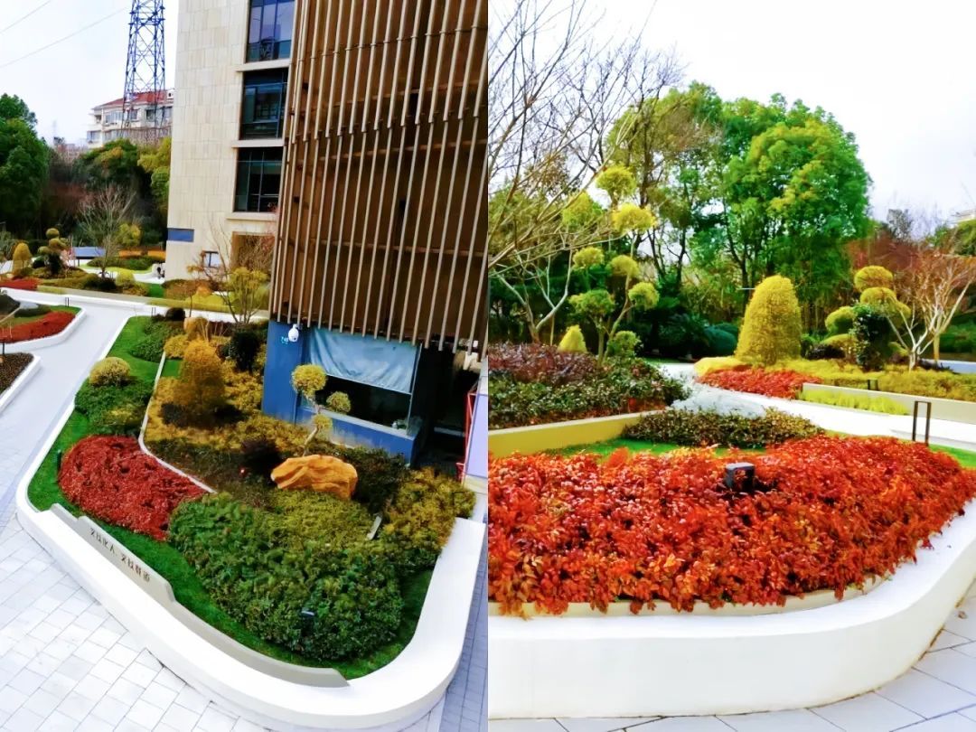 绿地中整体设计结合建筑特点与广场空间,种植了樱花、红梅、茶梅柱、紫薇、羽毛枫、红枫、棒棒糖等乔木,部分花坛采用花境布置的手法,增加泰山石、黄蜡石作为旱景部分,营造四季分明、色彩斑斓的景观,仿佛城市中的园林,给市民提供舒适、通透、优美的环境品质。