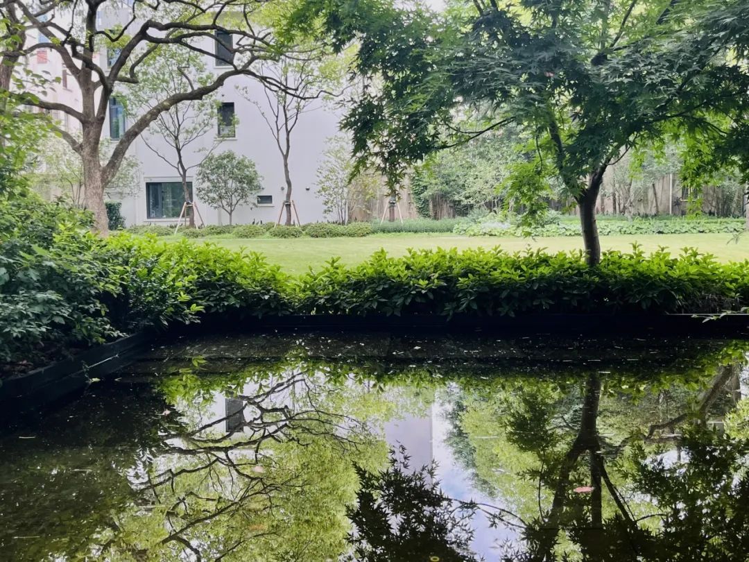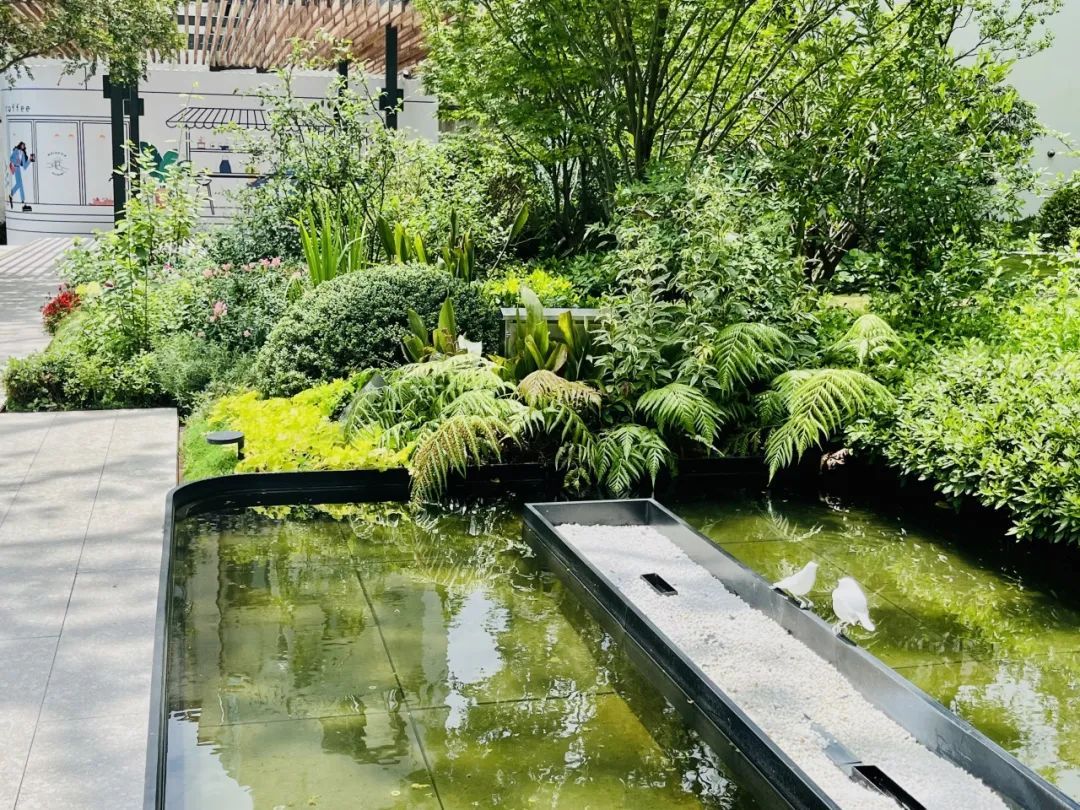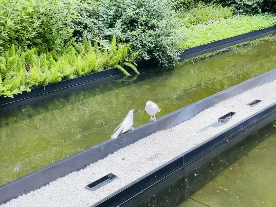如今初夏时节,在微风的吹拂下,水池上的小鸟雕塑栩栩如生,潺潺的水声与树叶婆娑的声音温和地消减和隔绝了城市的噪音与喧嚣。
