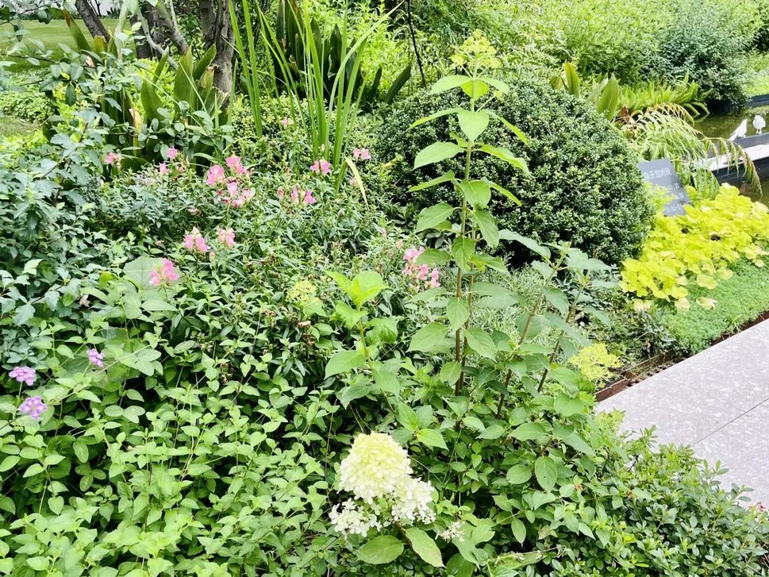 精心设计的花境运用自然式造景的方式,金叶箱根草、玉簪、穗花婆婆纳等开花色叶灌木高低错落,靓丽和谐,路边的树荫、凉亭下的长椅上坐满了人,行人不时停留拍照……