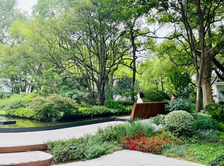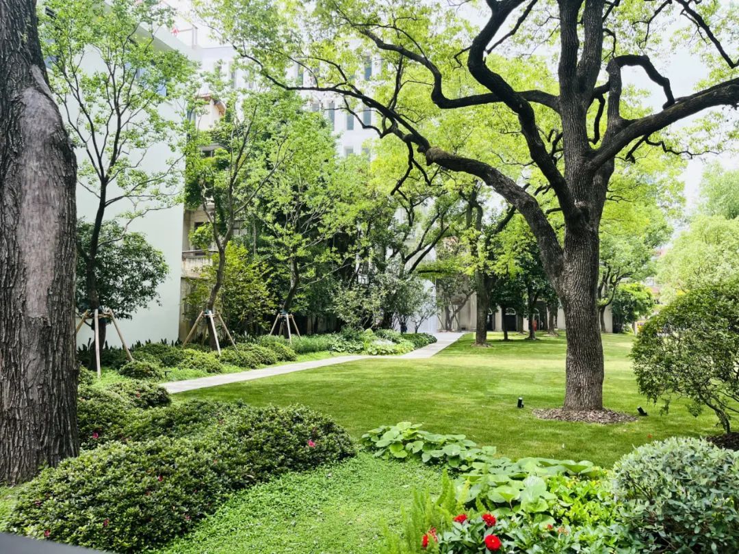 阳光透过绿地中原有的高大乔木的缝隙,洒落下斑驳的影子,仿佛在讲述着关于时间、历史和文化的故事。
