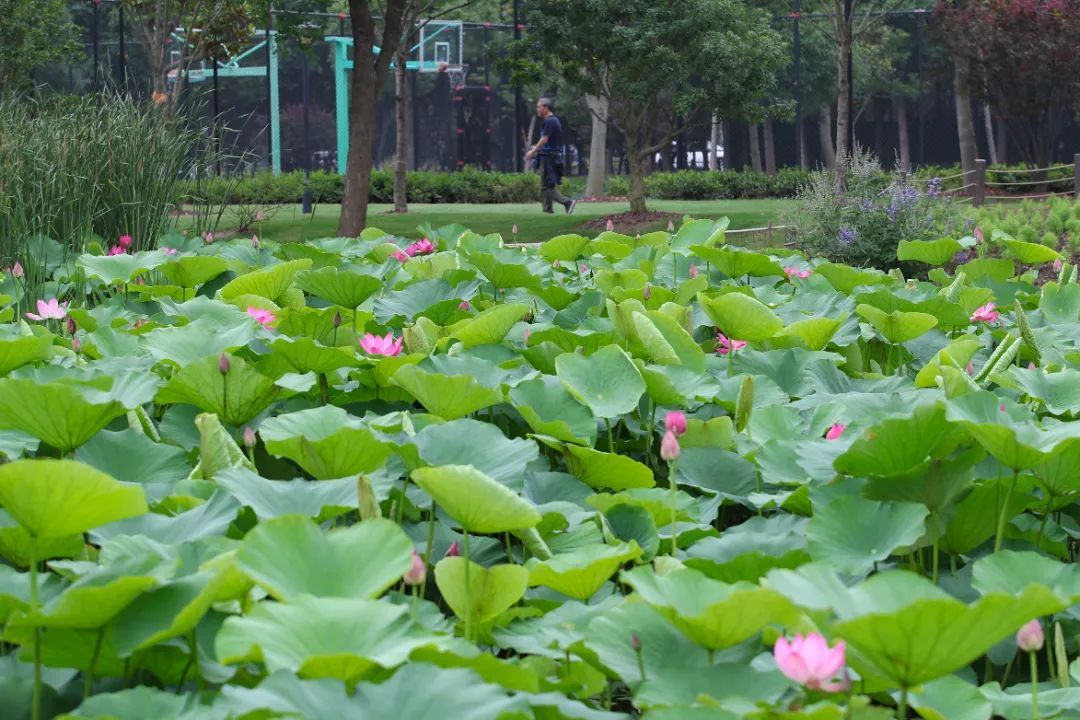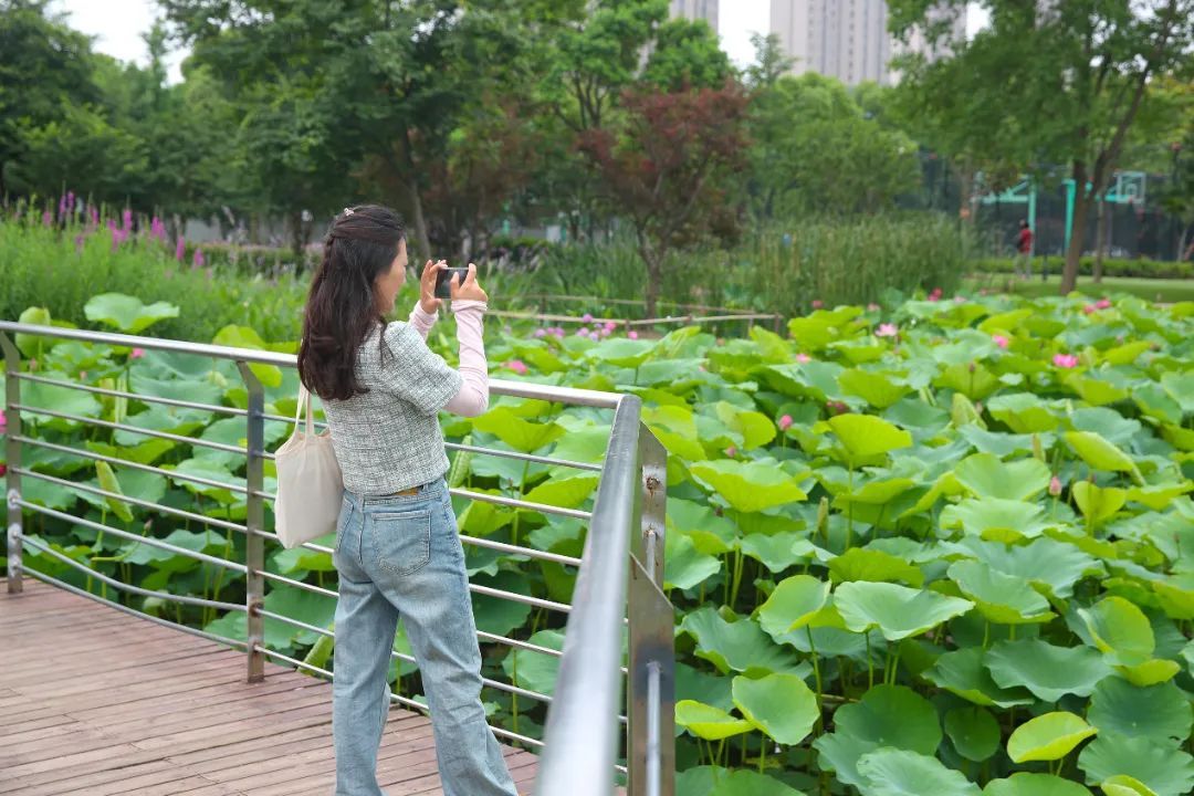 记者在方松体育公园内看到,荷塘里荷叶青翠,花苞初放,粉红翠绿,雅致十足。微风吹拂,翻动着荷叶层层叠叠向远处铺展而去,粉色花朵也随着荷叶摇曳。漫步在荷塘边,幽香荡漾,沁人心脾。
