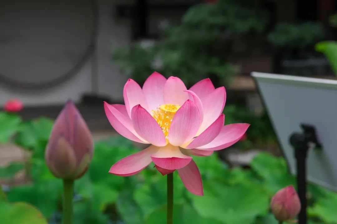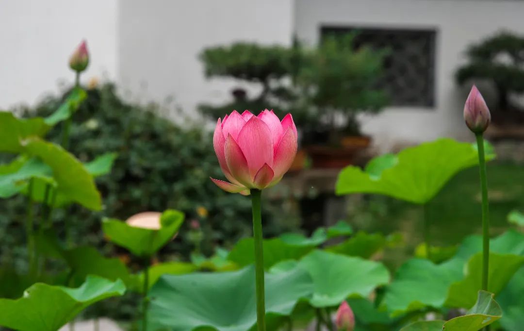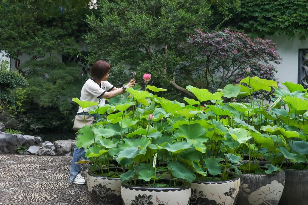 在醉白池公园的荷花培育点,只见大大小小的荷花陆续盛开,浓墨重彩的荷叶,衬托着娇柔的荷花,偶尔清风徐来,荷叶轻摇,粉荷在此温柔轻舞,吸引了不少游客前来赏花观景,淡雅的花色与醉白池公园的古建筑相映成趣,构成了一幅江南初夏的迷人景致。