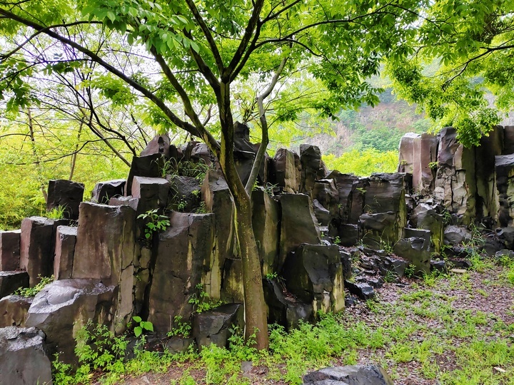 从高空俯视,即可发现捺山茂密植被中隐藏着一个主火山口、四个副火山口,仿佛对应着人类的五指、五官、五肺,以统摄一座山的骨骼、血脉、气韵。半山腰处,玄武岩石柱冷峻似铁,黑白相间,或抱团昂立,顶天立地;或成群扑倒,壮烈献身;或忍辱负重,俯首躬身,还有三四块飞石,在剧烈运动时失去重心被抛到山坡下成了孤儿弃婴。读读这些生动形象的景点名字吧——云墩、大石柱、白龙泉、獾家峪、雨花谷、捆石坡、回龙洞,移步换景,一路让人浮想联翩。云,都生根化育成“墩”了,还有什么不能栖息、常驻?