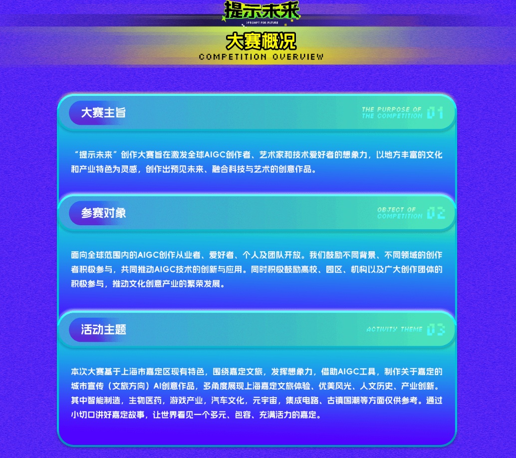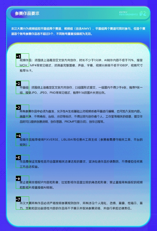 大赛设置了视频组和平面组两个赛道,参赛作品要求围绕“嘉定文旅”主题进行创作。大赛将提供丰厚的奖励,包括现金奖励和AIGC工具订阅服务,以表彰优秀创作者的努力和才华。