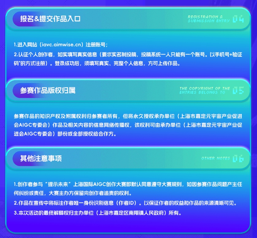 此次大赛特别强调参赛作品的原创性和法律合规性,任何涉嫌抄袭或侵权的行为将被严肃处理。大赛希望通过此活动,推动文化创意产业的繁荣发展,为全球AIGC领域带来新的活力。