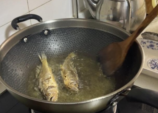 2.锅中热油,依次放入小黄鱼,小火煎至两面金黄酥脆后捞出。