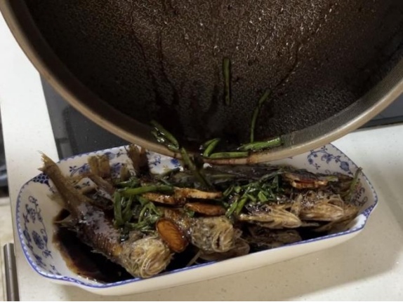 4.将汤底浇在小黄鱼表面,装盘即可。