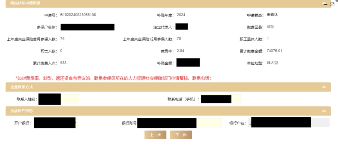 3. 用人单位选择“愿意接受补贴并承担相应义务”后,进入信息确认界面,需重点对裁员率、划型、补贴金额、银行账户等信息进行确认。