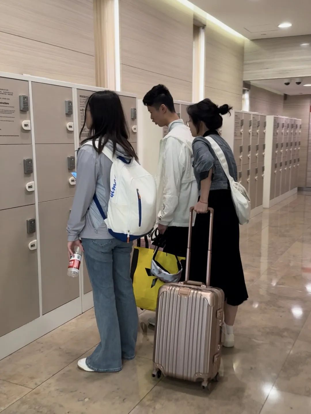 两名游客打开空柜子,放好东西,关上门,然后在密码锁中设置好自己的密码,再按#号就锁上了柜门。