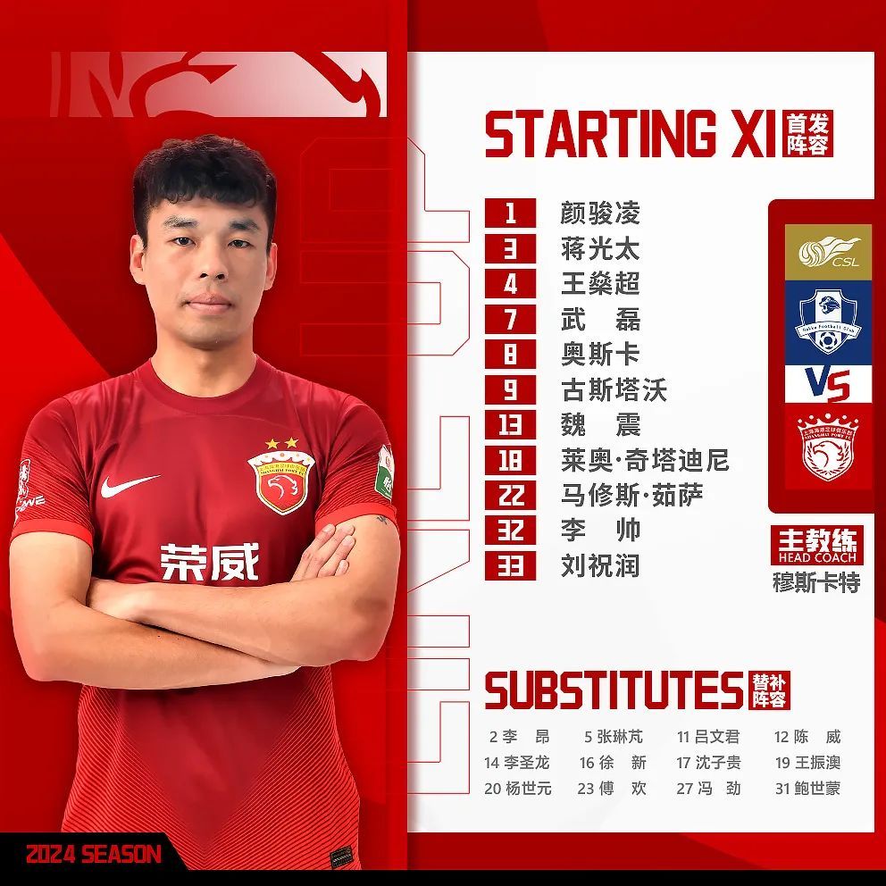 上海海港首发:1-颜骏凌、3-蒋光太、4-王燊超、7-武磊、8-奥斯卡、9-古斯塔沃、13-魏震、18-莱奥·奇塔迪尼、22-马修斯·茹萨、32-李帅、33-刘祝润