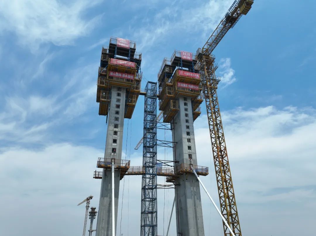 跨沪陕高速公路特大桥总长20.8公里,其中主桥自西北向东南斜跨G40沪陕高速公路,与高速公路斜交24度,是上海至南京至合肥高铁安徽段重难点工程。该特大桥主桥长497米,设计为双塔双索面预应力混凝土斜拉桥。两个塔柱分别划分为11个节段进行浇筑,每个节段浇筑高度为4.0米左右,此次为塔柱最后一个节段浇筑。
