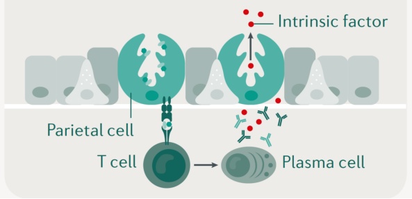 泌酸腺收到自身免疫攻击后发生进行性破坏,而影响了维生素B12、叶酸、铁等微量元素的吸收,继而引发恶性贫血或缺铁性贫血。后者是由于低胃酸反馈性引起胃窦G细胞的增生,促进胃泌素的大量分泌,促使胃体肠嗜铬细胞的增生或异形增生,进一步发展为I型胃神经内分泌肿瘤。由于维生素B12的缺乏,影响了细胞DNA的合成,累及小肠上皮时还容易导致吸收不良、腹泻等症状的发生,严重时可累及神经系统,表现为肢体麻木、共济失调、脊髓亚急性联合变性,甚至健忘、焦虑抑郁等精神障碍。