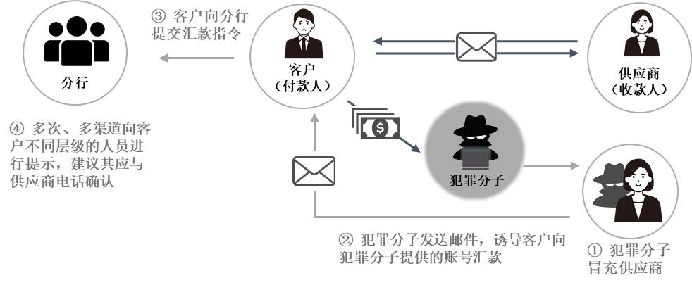 基于趋势监测与归纳总结,该行向内外部持续宣教。对外部,总行合规部门与宣传部门、营业部门合作,通过银行微信公众号、客户经理邮件等途径,及时向客户提示欺诈风险,提高客户警惕性。对内部,总行合规部门根据监测到的趋势制作有针对性的培训资料,依托母行提供的商业电子邮件欺诈主题素材制作中文宣传资料,详细拆解冒充供应商、公司CEO实施诈骗的两大常见手法及具体对策等,不定期通过会议、培训等向全员宣传,帮助一、二线员工提高日常工作中识别欺诈手段的能力,并熟悉当发现客户可能正在遭受欺诈时,应该进行的对客提示。