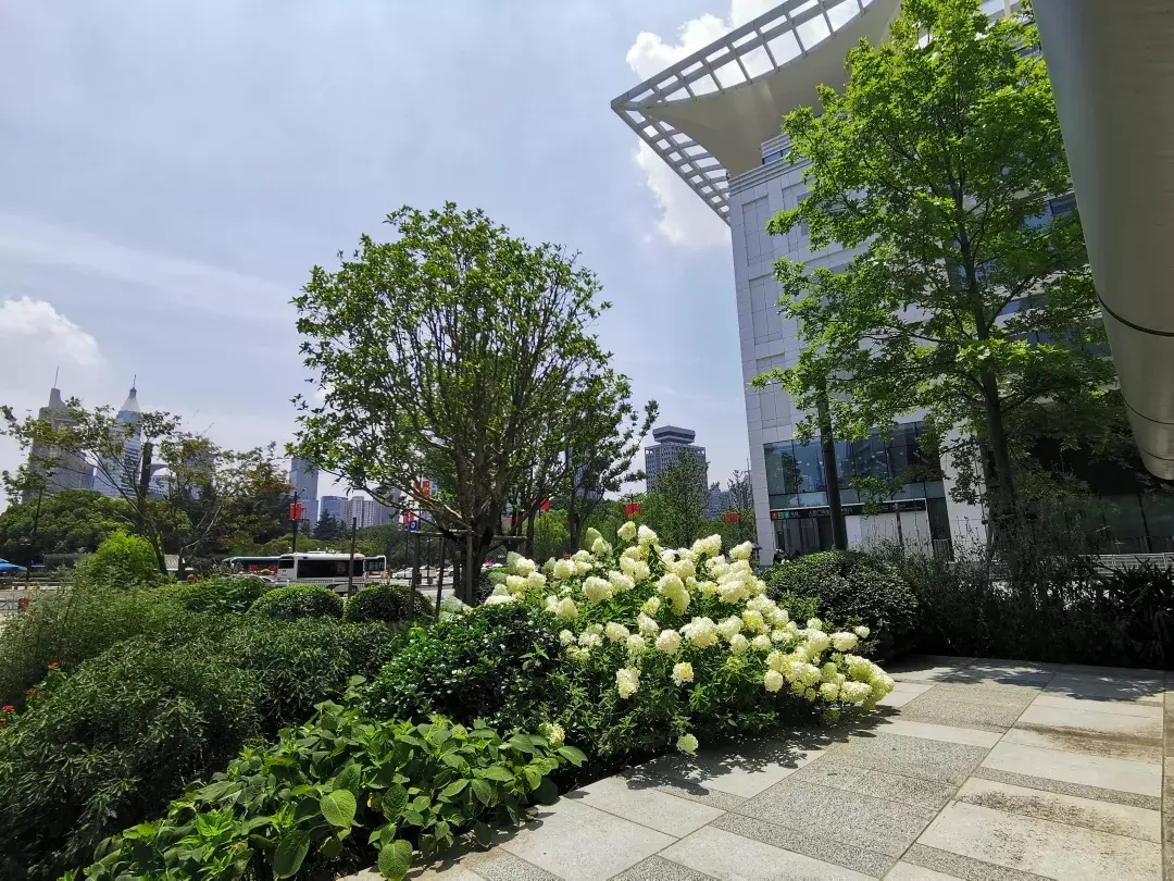 在上海城市规划展示馆周边更新绿地上,以三五棵组合点缀的手法栽植着八仙花,主要品种有圆锥绣球“石灰灯”、 “无尽夏” 、园艺八仙等。不同的八仙花,颜色和姿态各不相同,有的甜白,有的粉红,有的宝蓝,有的含苞待放,有的正值盛开,花影婆娑,美不胜收,尽现唯美浪漫。