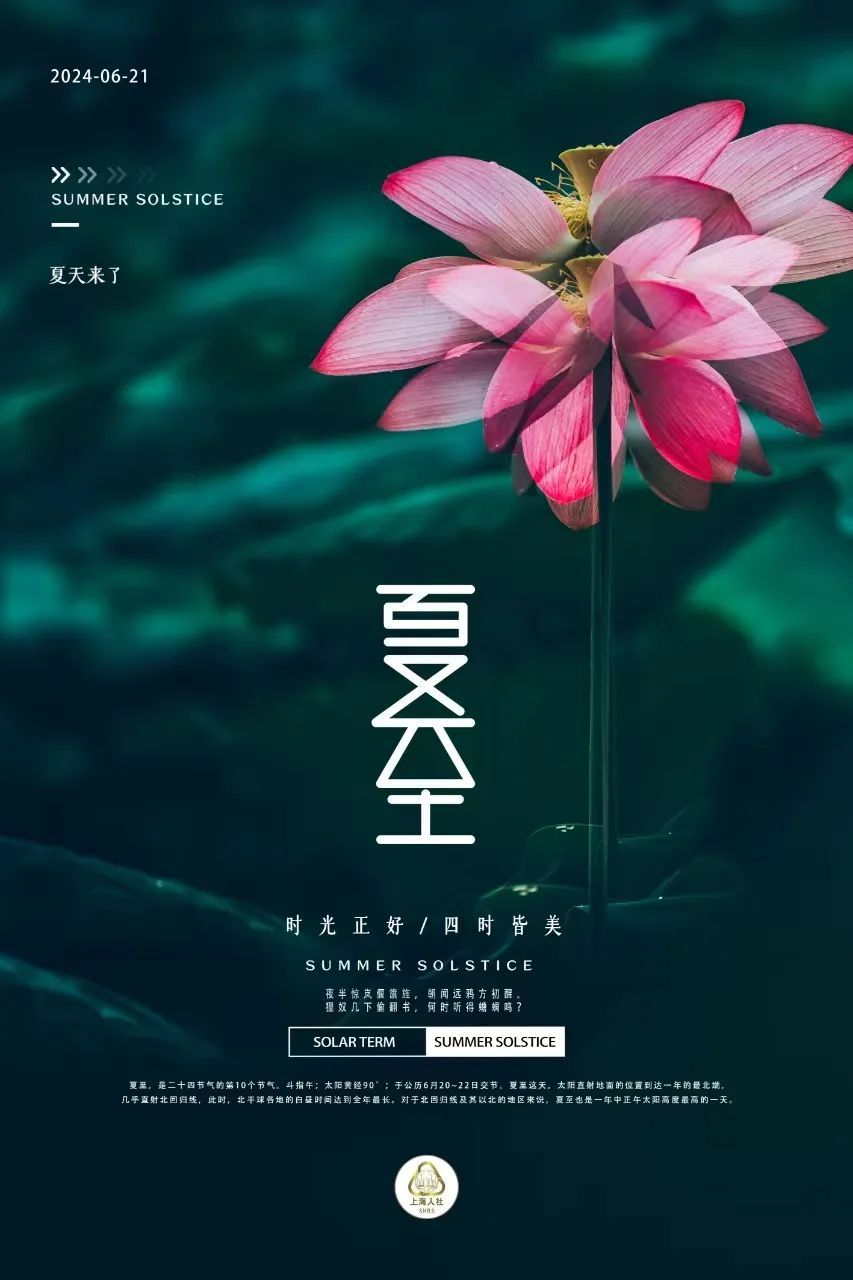夏至是“二十四节气”中最早被确定的节气,早在春秋战国时代,中国人就有了日南至、日北至的概念。夏至,太阳直射地面的位置到达一年的最北端,几乎直射北回归线,是北半球昼最长的一天。夏至时,美好的光阴极度趋近,盛放出一个灿烂的夏。