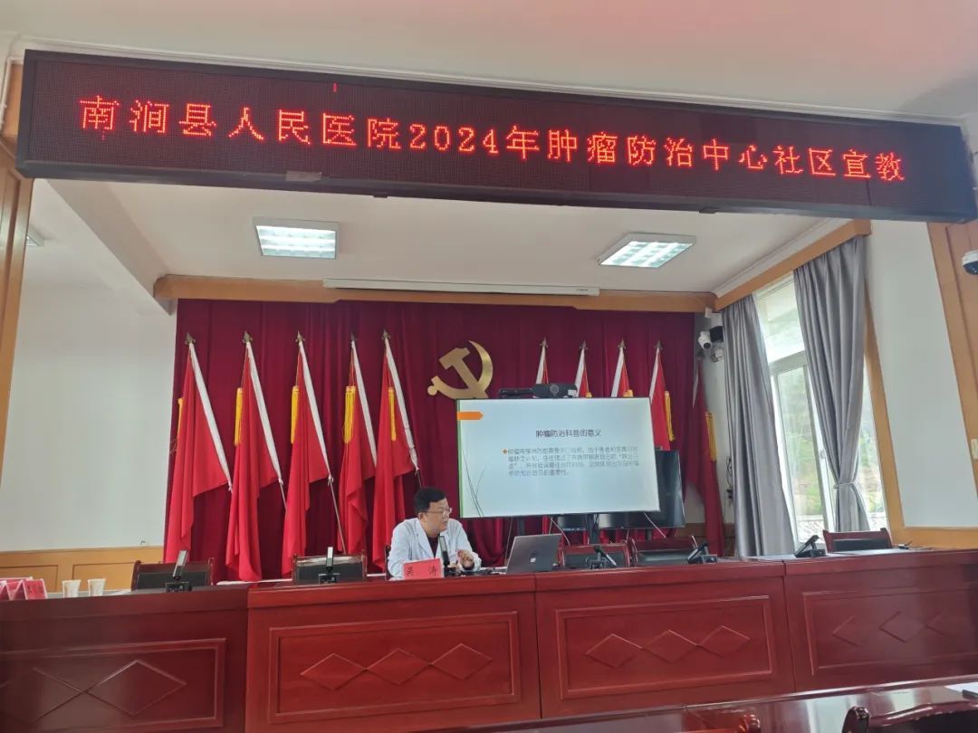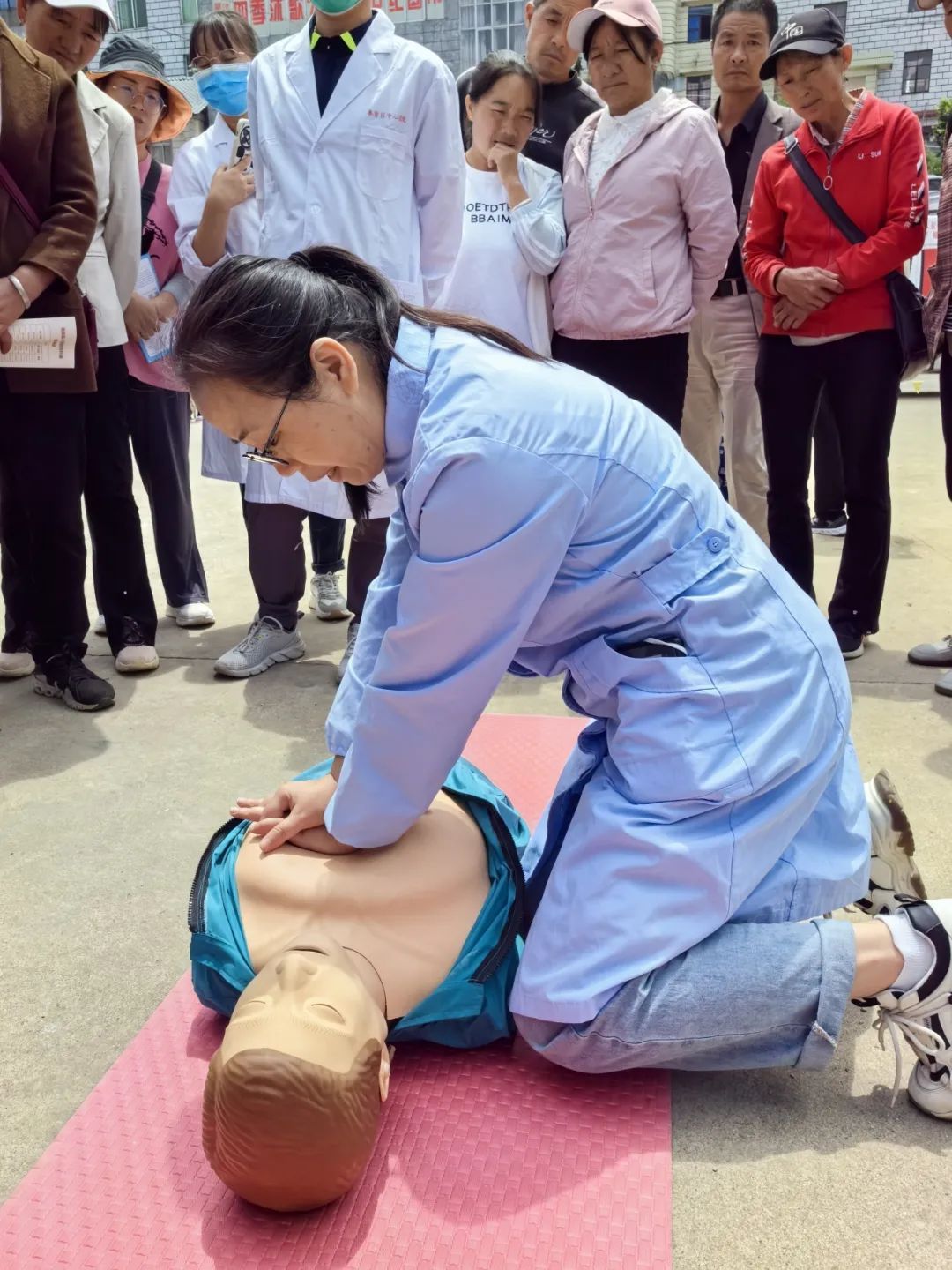 医疗队队员吴涛就《肿瘤防治》向镇卫生院职工及周边百姓科普肿瘤防治知识,临时党支部书记王英现场演示了心肺复苏。
