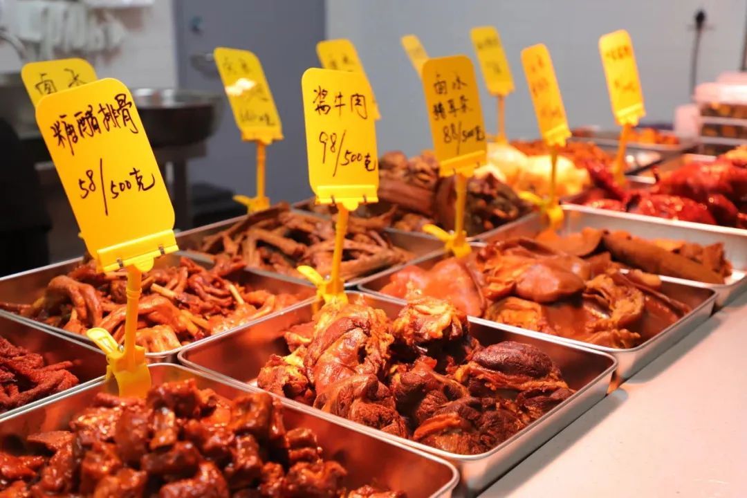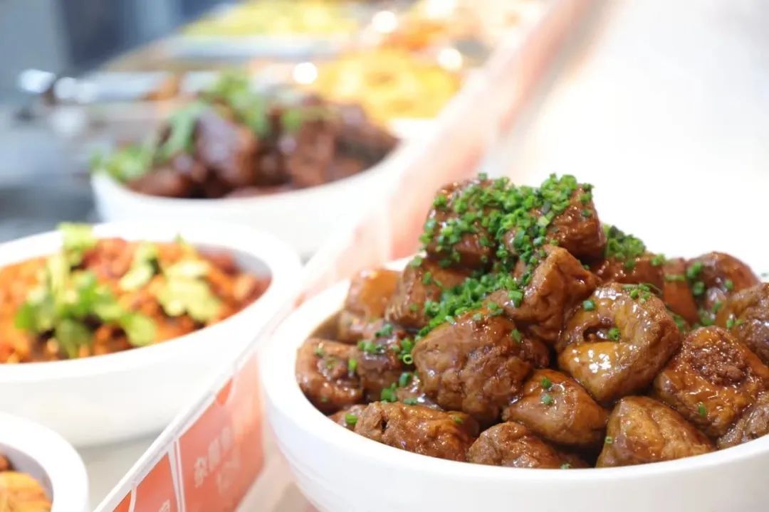 红烧肉、葱烤大排、糖醋小排、四季烤麸、鱼香茄子......自选菜区内,近40道炒菜和靓汤新鲜出炉,饭菜香扑面而来,居民们有序地排着队在琳琅满目的菜品中挑选,馆内洋溢着浓浓的烟火气。