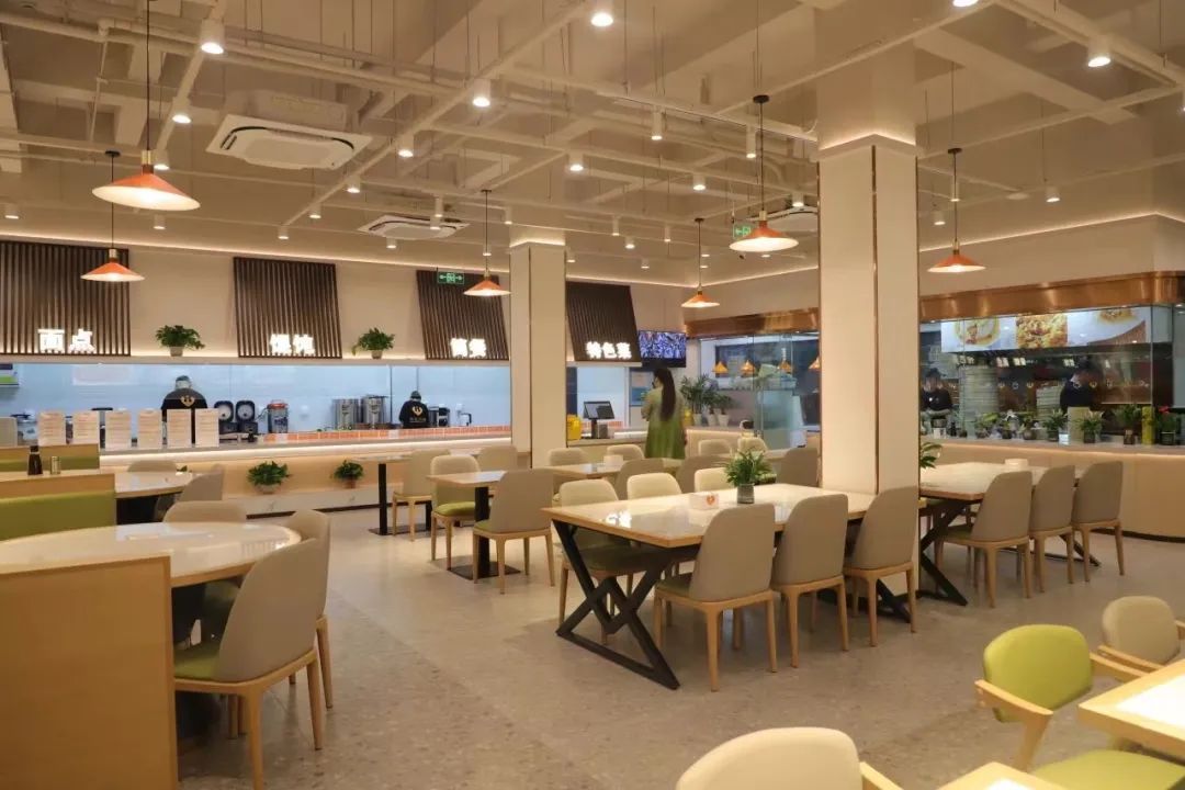步入馆内,温馨明亮的装修风格和木质的桌椅营造出温暖的感觉。空间设计十分宽敞,还设有包房,可以满足不同居民家庭的就餐需求。馆内设有熟食区、早餐区、自助区、结算区等功能区域,让每一位前来就餐的居民都能享受到更加舒适的就餐体验。墙面上设有监控大屏,多个画面展示了后厨制作美食的过程及卫生情况,用餐更加透明、安心。