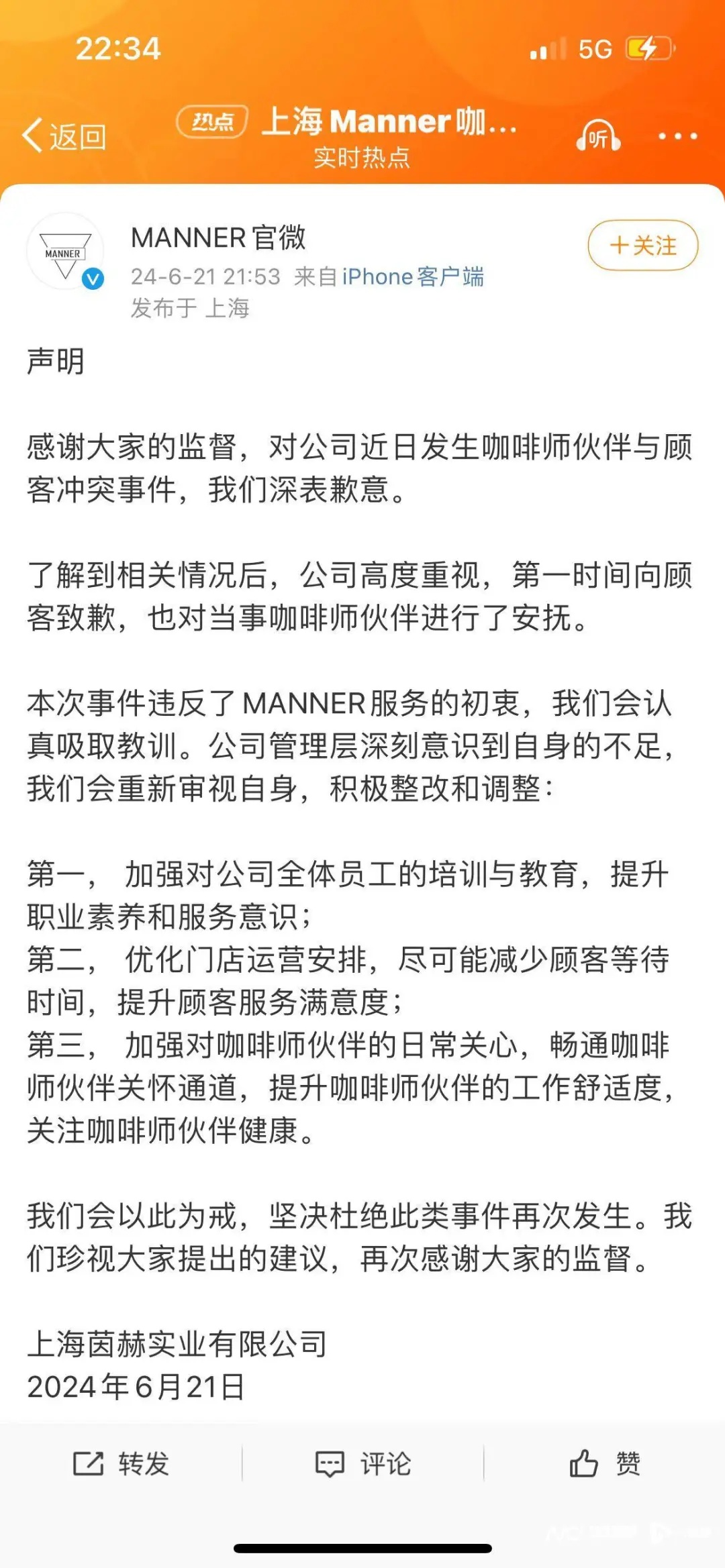 近日,咖啡品牌Manner咖啡接连因店员和顾客冲突登上热搜。6月21日晚,@MANNER官微 发布道歉声明称,已第一时间向顾客致歉,也对当事咖啡师伙伴进行了安抚。