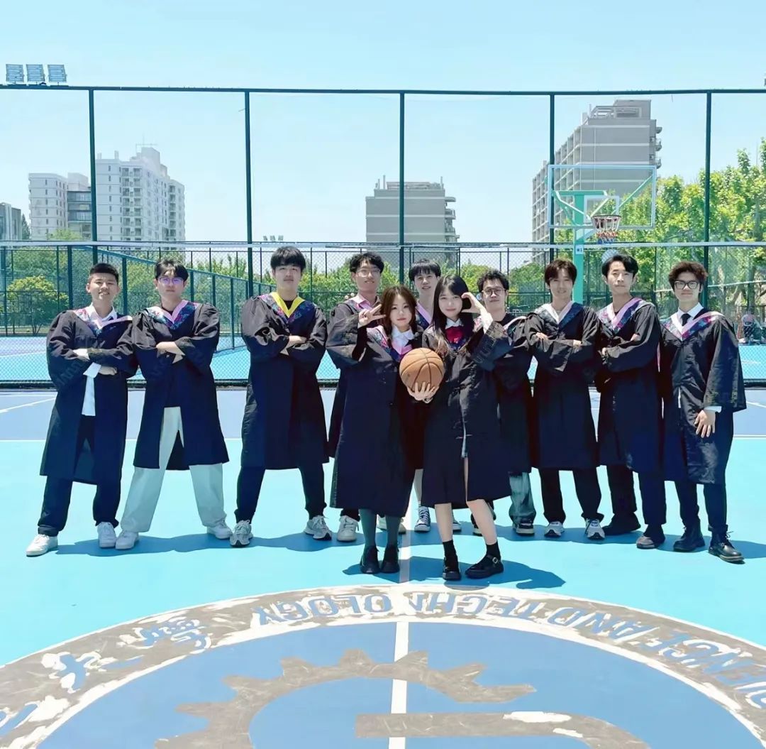 华东理工大学毕业生们在篮球场上合影,纪念曾经与篮球有关的时光以“SISU”为背景,上海外国语大学毕业生们一跃而起,定格毕业的激动和成长的喜悦东华大学的毕业生们在校门口与母校“同框”,记录毕业珍贵时刻