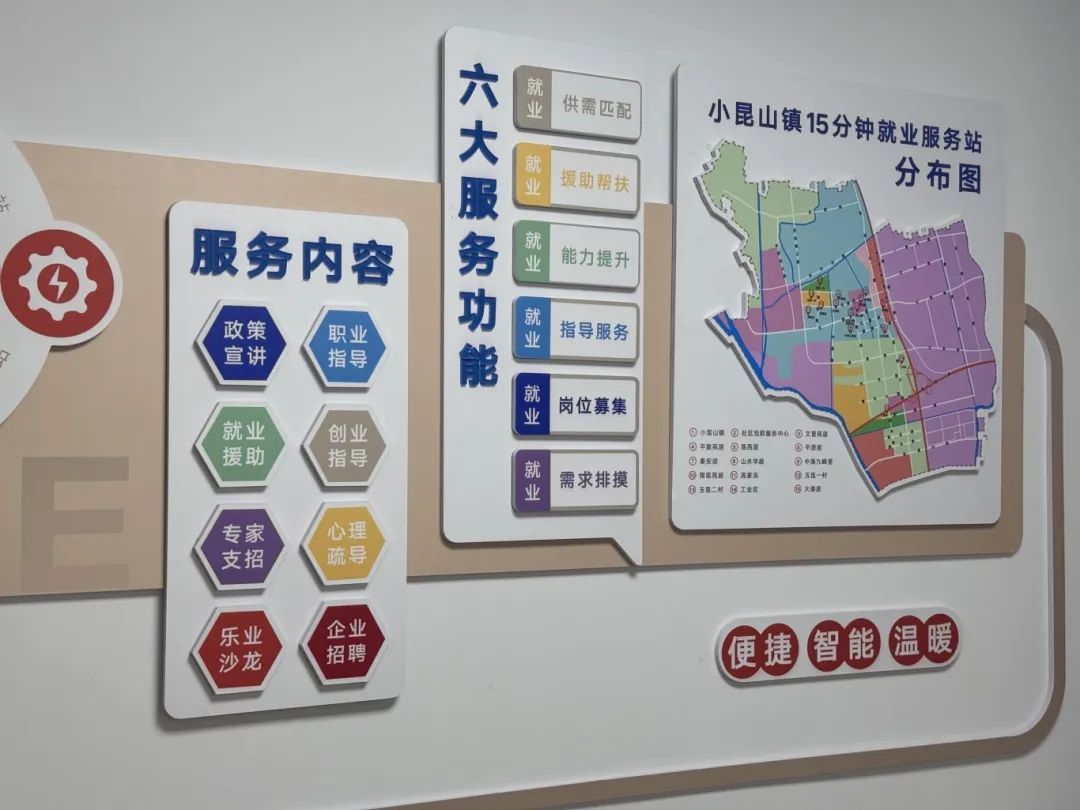 今年5月,小昆山就业服务站和大港社区就业服务站全面提档升级,拓展了服务空间。利用地处集镇区和大港片区“15分钟社区生活圈”的核心地段优势,通过服务站落实上海市“15分钟就业服务圈”建设要求,把招聘会开到居民家门口、开到线上直播间,把就业服务及时送到社区居民手中,助力重点群体就业创业,提升就业服务水平。