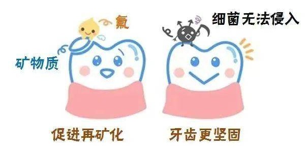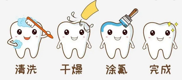 涂 氟 给牙齿穿上保护衣 随着生活水平的不断提高,孩子吃的食物种类也越来越多,许多孩子还有喝夜奶、吃甜食、不吃硬物等不良口腔习惯,同时由于家长对孩子乳牙的重视程度不足,从而导致儿童龋齿患病率居高不下。所以预防龋齿发生十分重要,今天便先给大家讲一讲“涂氟”。 01 涂氟是什么? “涂氟”是使用高浓度的氟化物涂在牙齿表面,干燥后形成一层含氟的保护层,是一种常见的预防龋齿的方法。氟化物同时还能在一定程度上缓解牙齿对冷、热、酸、甜食物的过敏症状等。 02 为什么要涂氟? 涂氟的好处在于可以抑制细菌产酸,帮助牙釉质再矿化,所以对于患龋风险比较高的宝宝,定期涂氟相当于给牙齿上了层保险。 03 什么时候需要涂氟? 常规建议,孩子2~3岁之后开始涂氟。同时,美国牙医协会(ADA)建议,儿童每6个月至少涂氟1次,对于患龋高风险的宝宝,建议每年涂氟4次。 04 如何进行涂氟? 涂氟需由专业医生进行,首先清洁牙面,去除牙面上的软垢色素牙石,然后将每个牙齿都用棉球擦干或用气体吹干,保持牙面干燥。最后用小刷子把氟化物涂到牙齿表面。 即使宝宝用舌头舔,一般也不会舔掉。整个涂氟过程几分钟就可完成,完全不用担心“疼痛”方面的问题。 05 涂氟后就不会长蛀牙了吗? 涂氟只是一种预防性措施,可以有效降低龋病的发生概率,但并不是一劳永逸的。涂氟后还是需要坚持刷牙,做好口腔清洁,定期检查牙齿,对于龋病要早发现、早治疗。